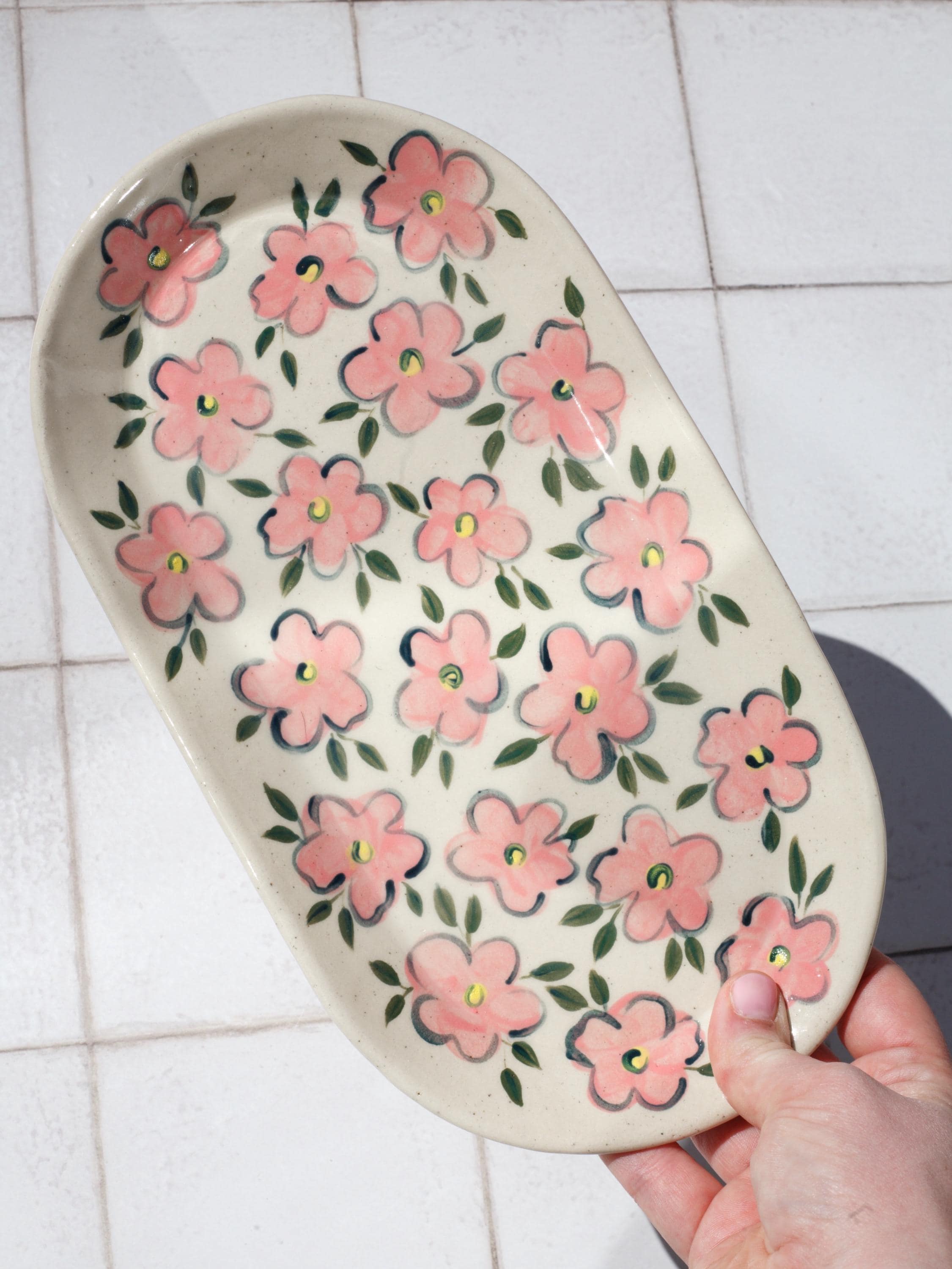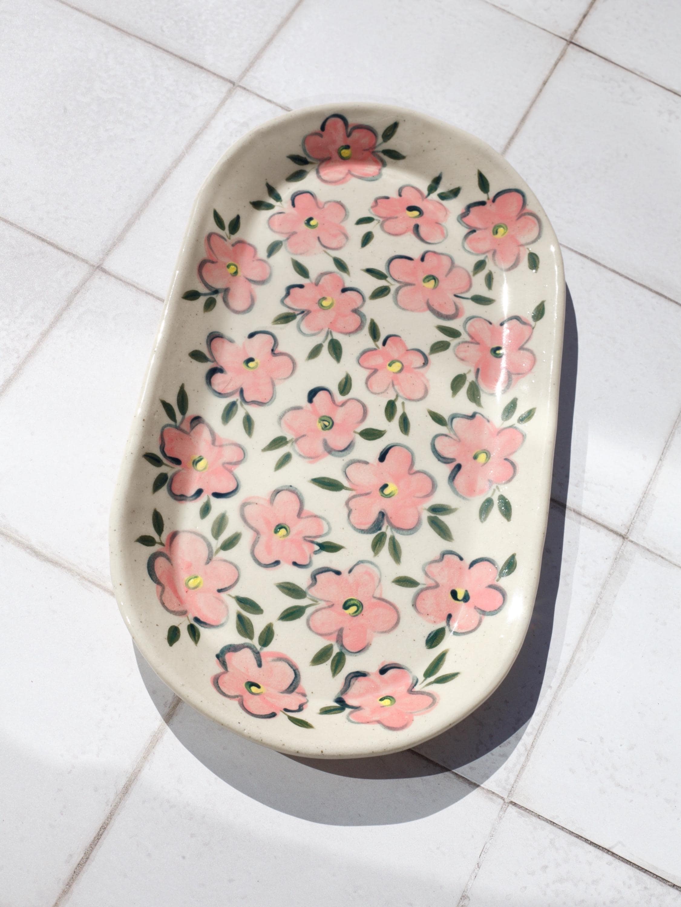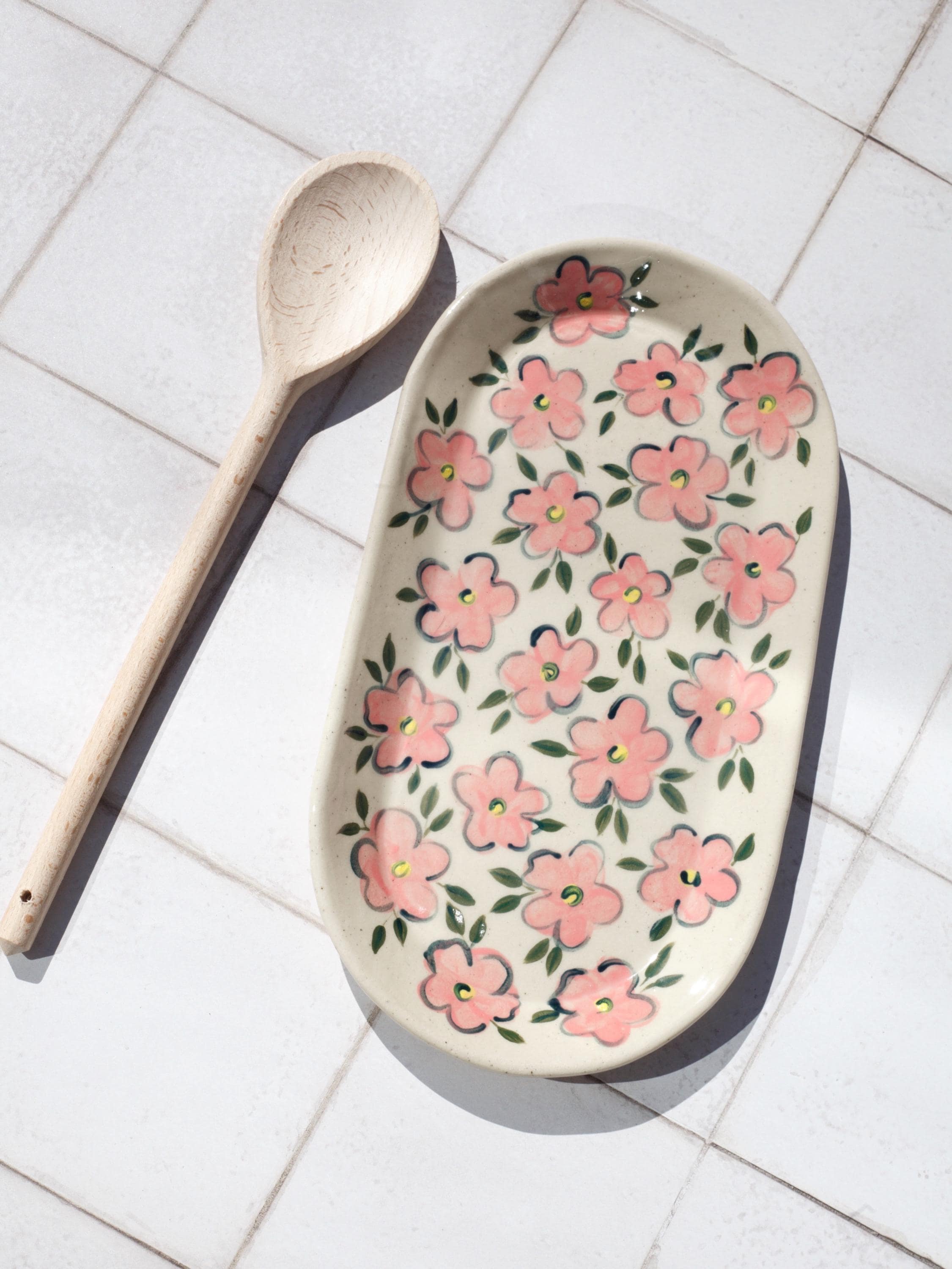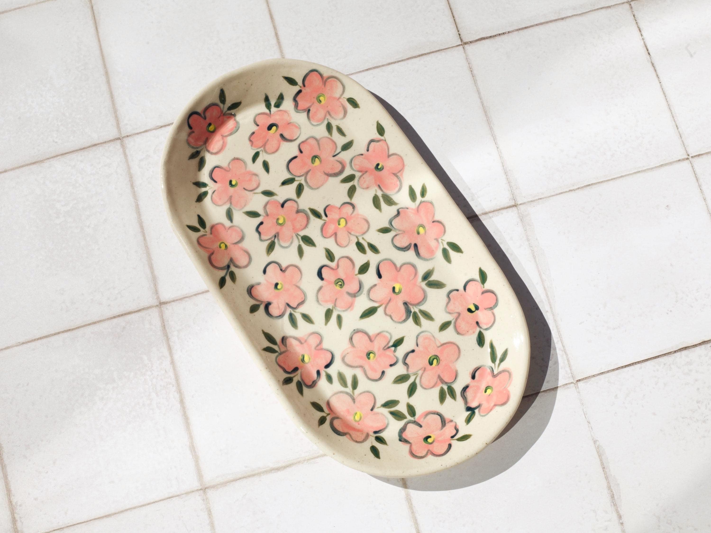 This hand-painted ceramic tray is a simple yet charming addition to your kitchen or dining table. Decorated with a delicate floral pattern in soft pinks and greens, this tray is perfect for serving small snacks, holding jewellery, or simply as a decorative piece.