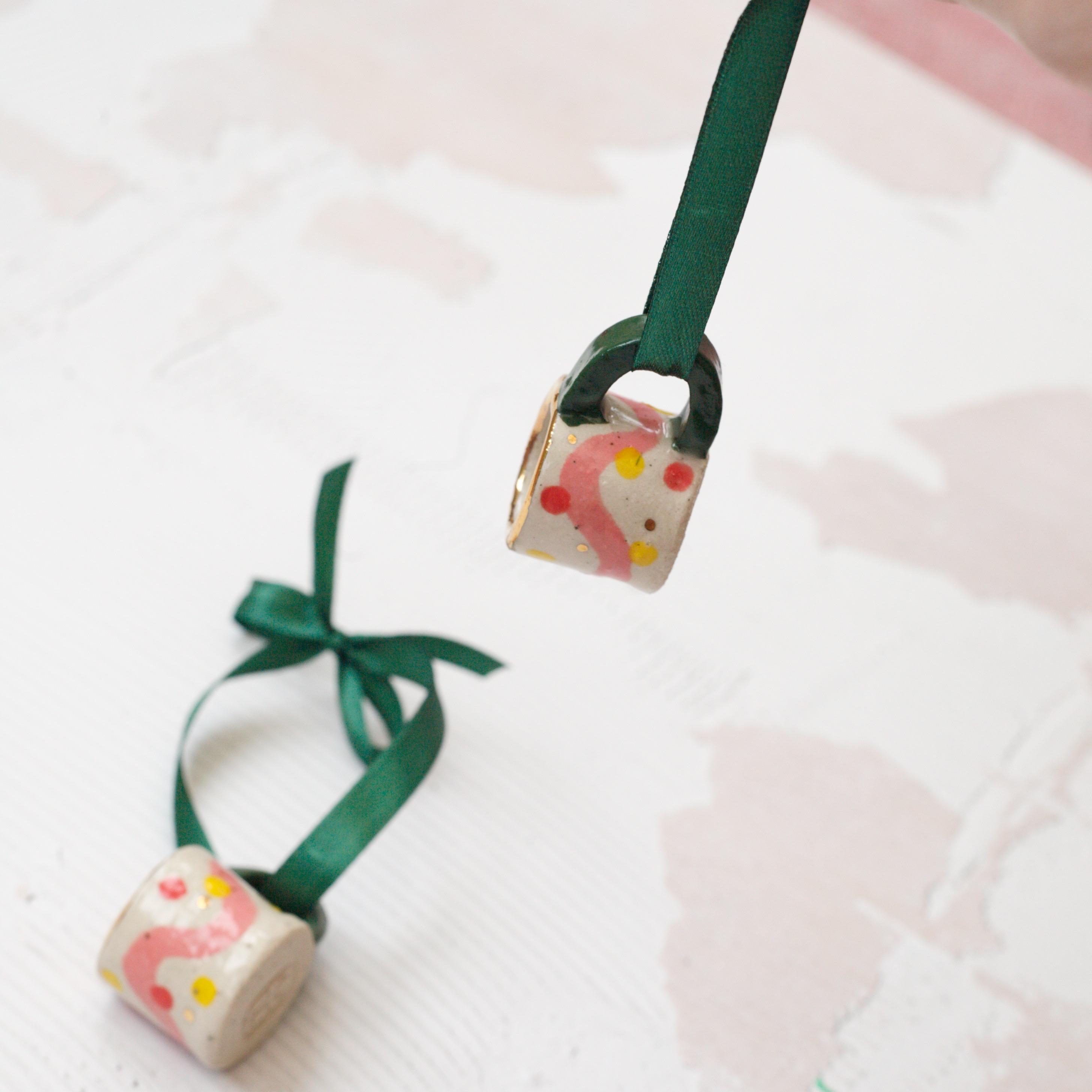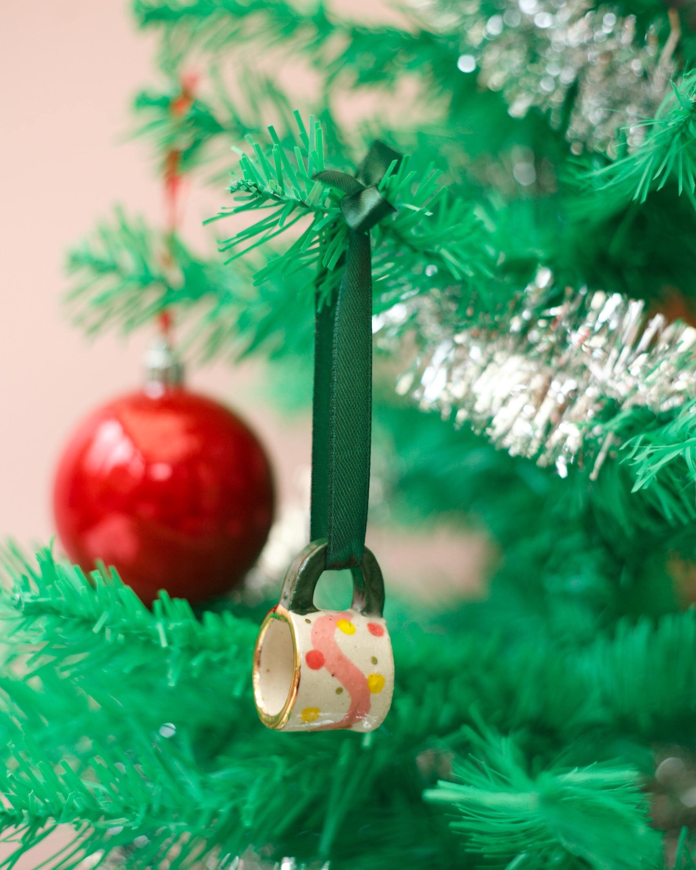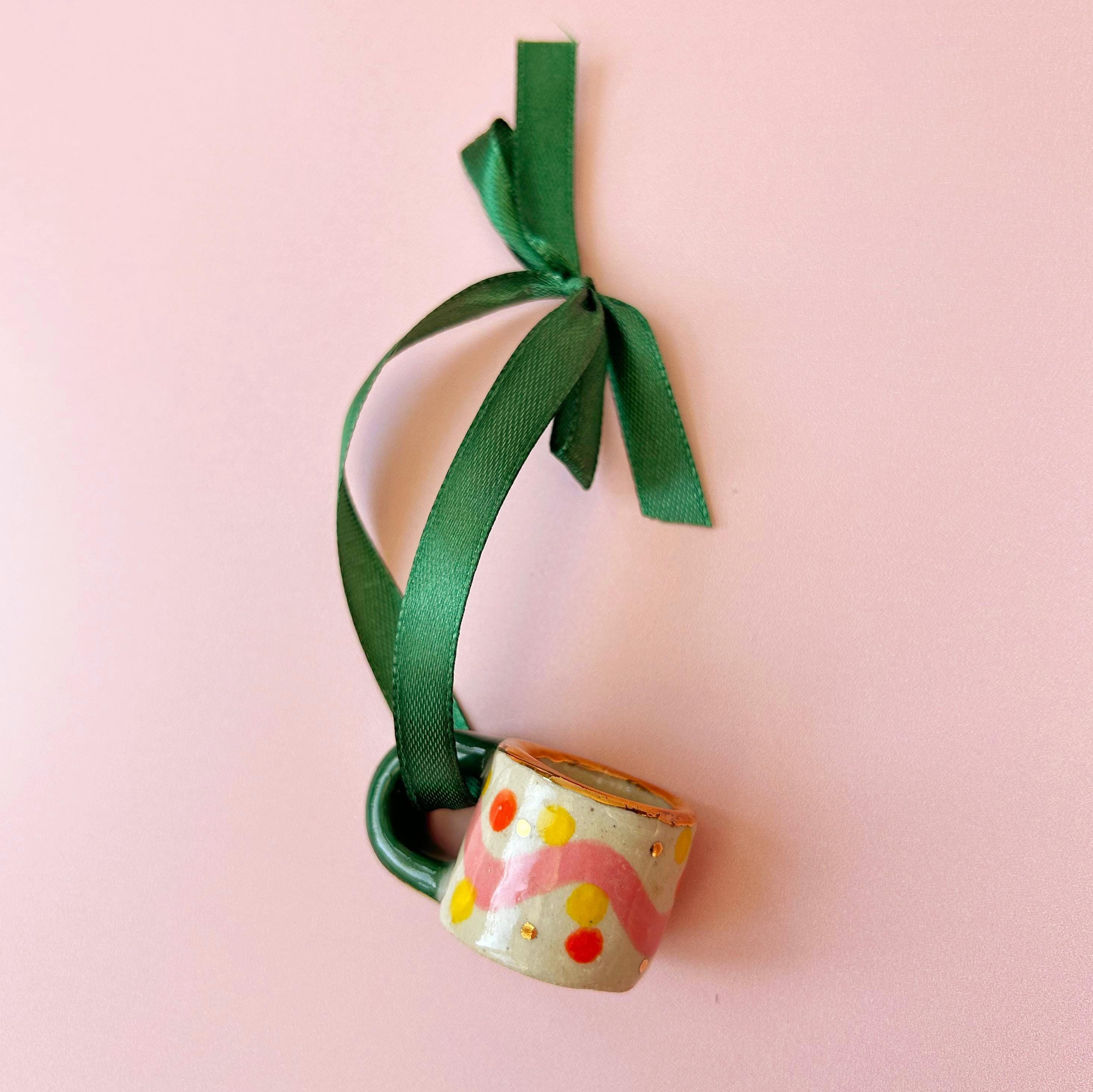Mini ornamental ceramic mug for the Christmas tree featuring a vibrant hand-painted design. Finished with genuine gold lustre accents, this unique piece can add a festive touch to your tree. It comes with a green ribbon for easy hanging, making it perfect for the holidays or as a year-round decorative accent.