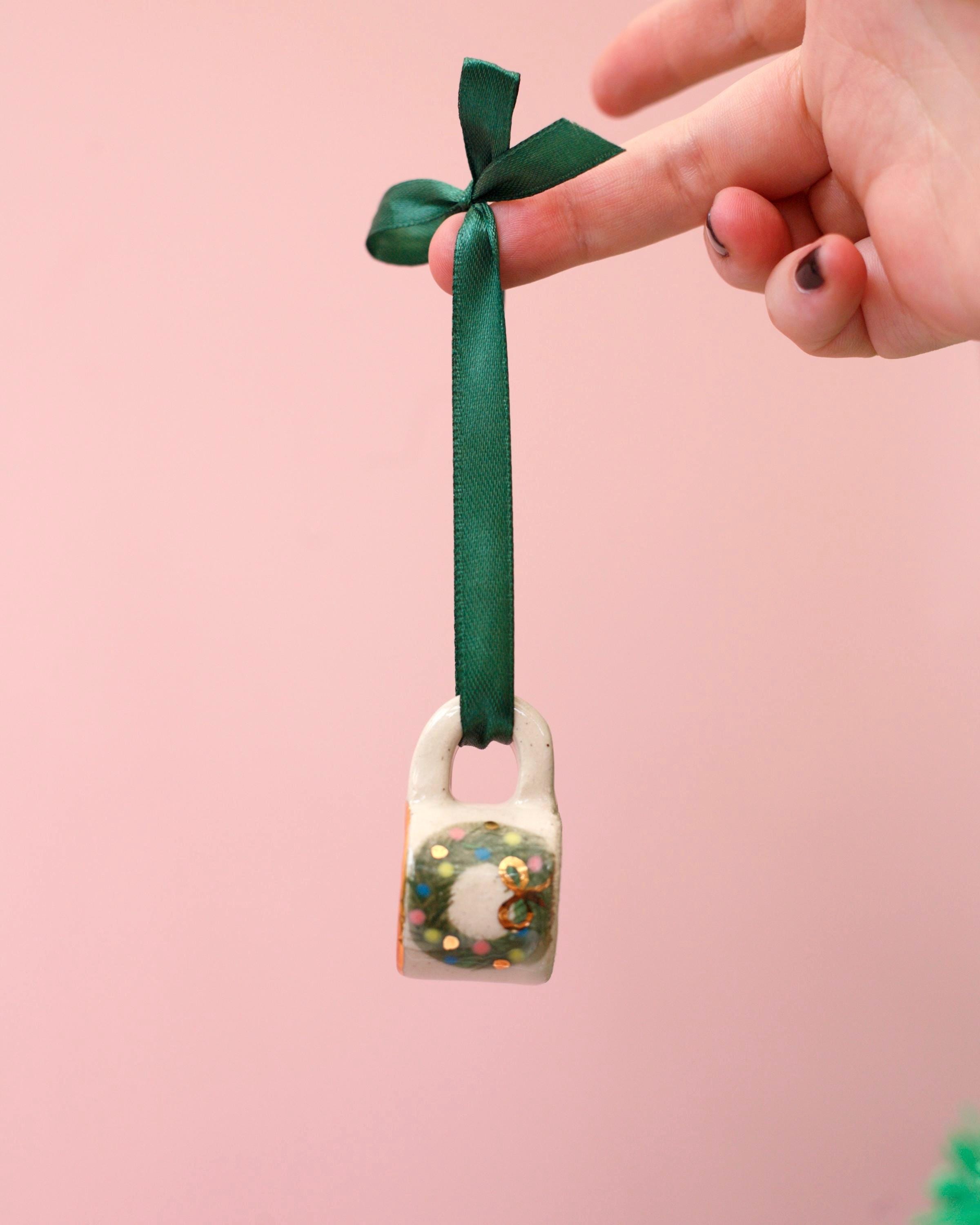 Mini ornamental ceramic mug for the Christmas tree featuring a vibrant hand-painted design. Finished with genuine gold lustre accents, this unique piece can add a festive touch to your tree. It comes with a green ribbon for easy hanging, making it perfect for the holidays or as a year-round decorative accent.