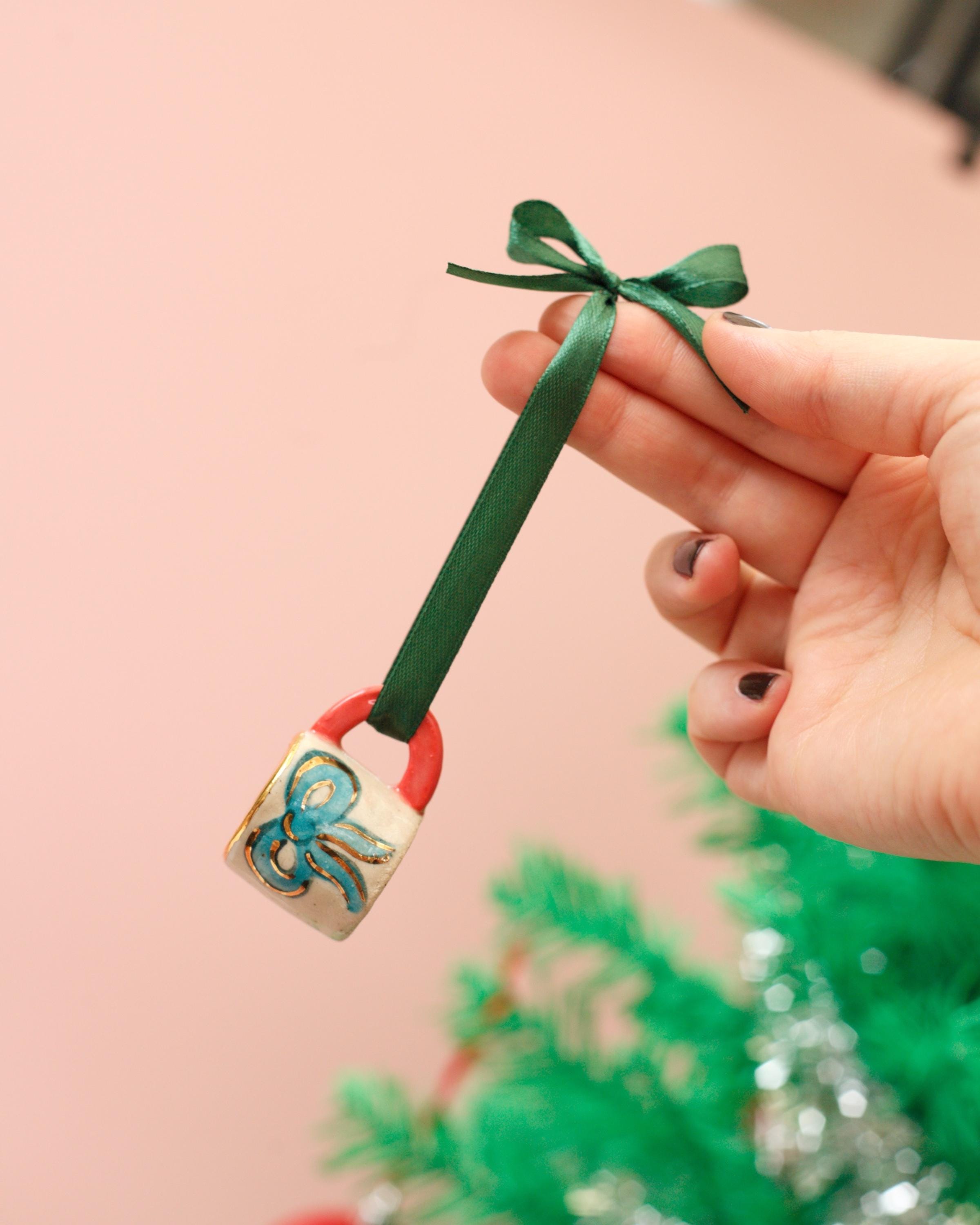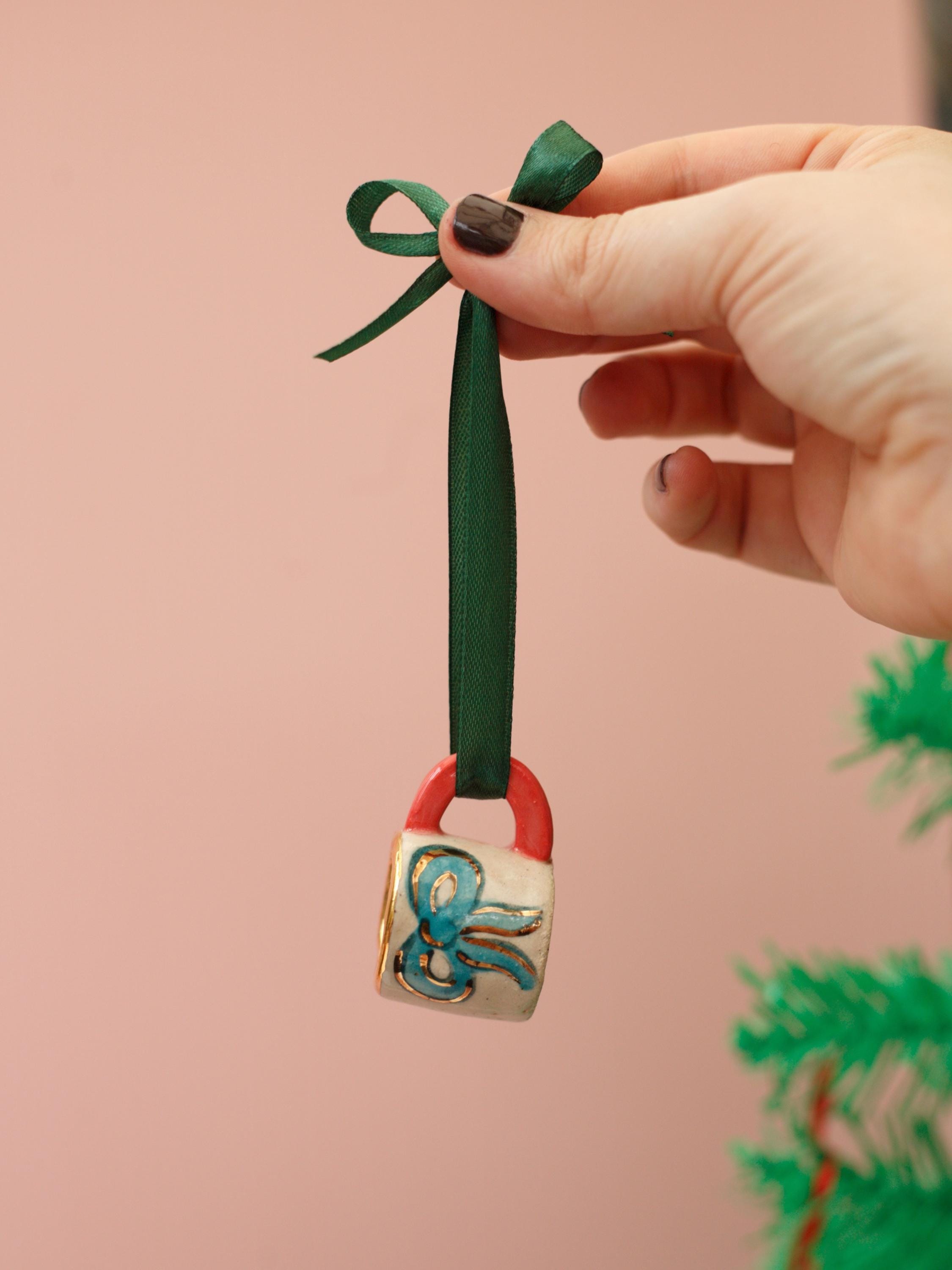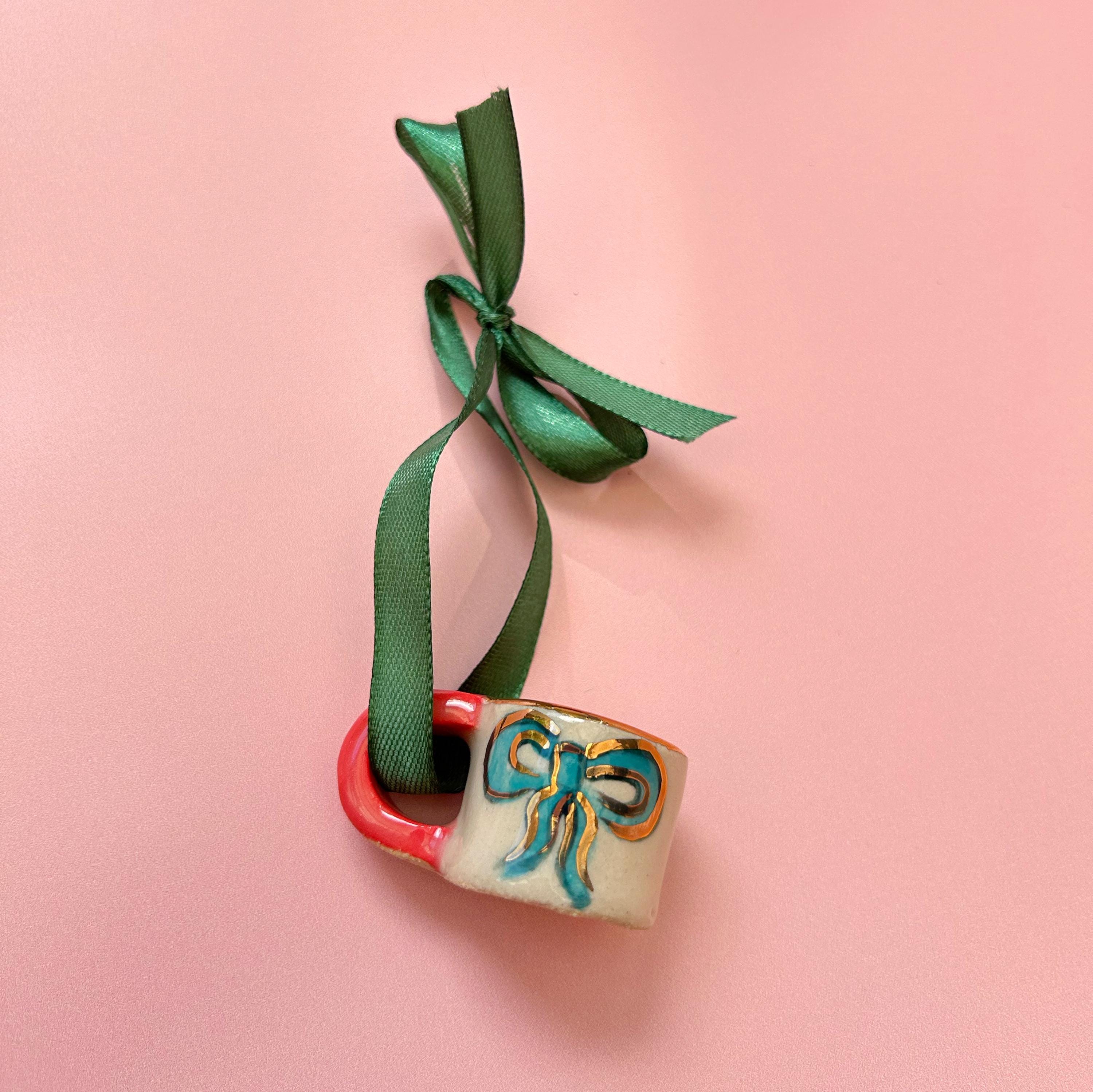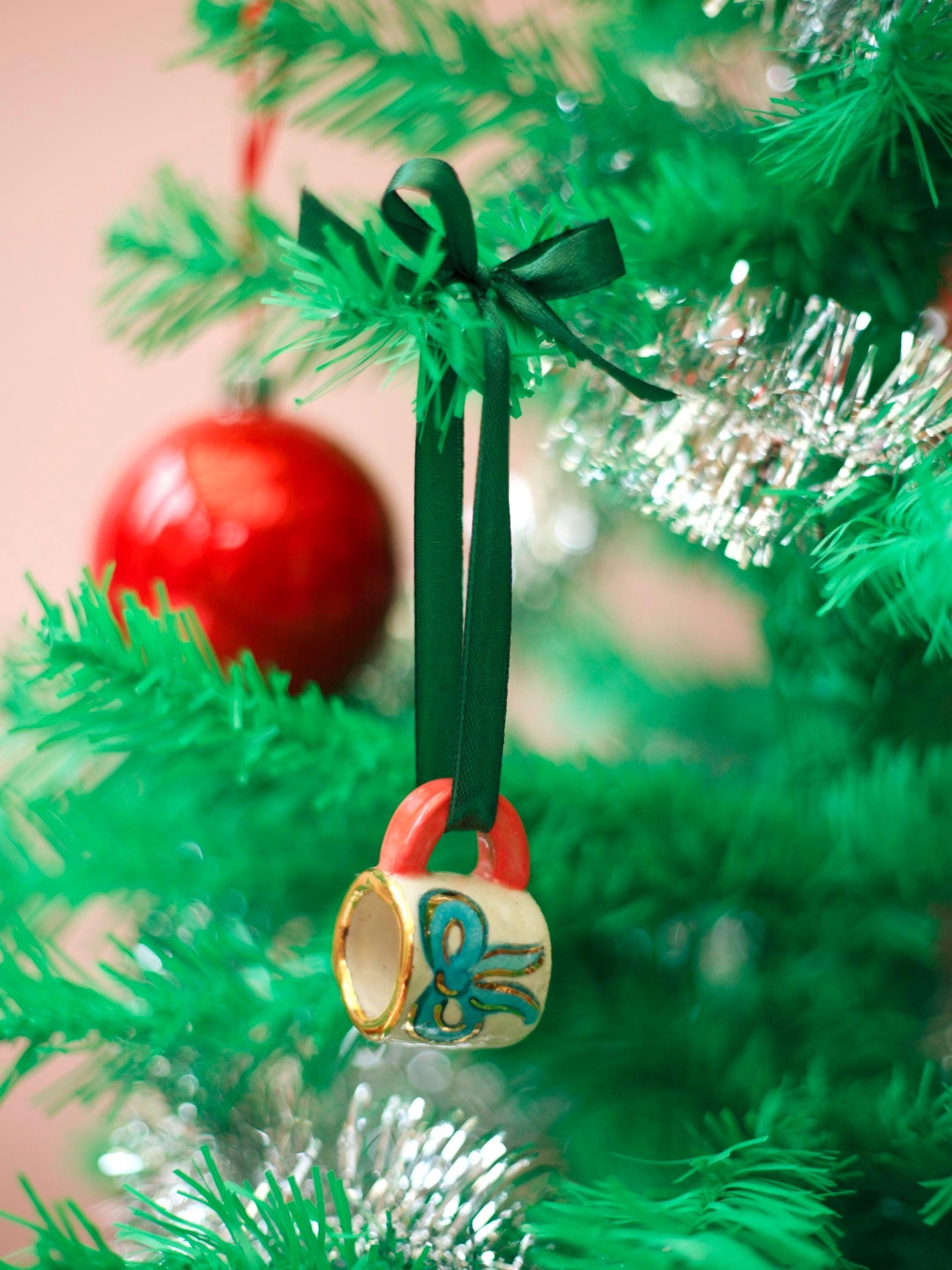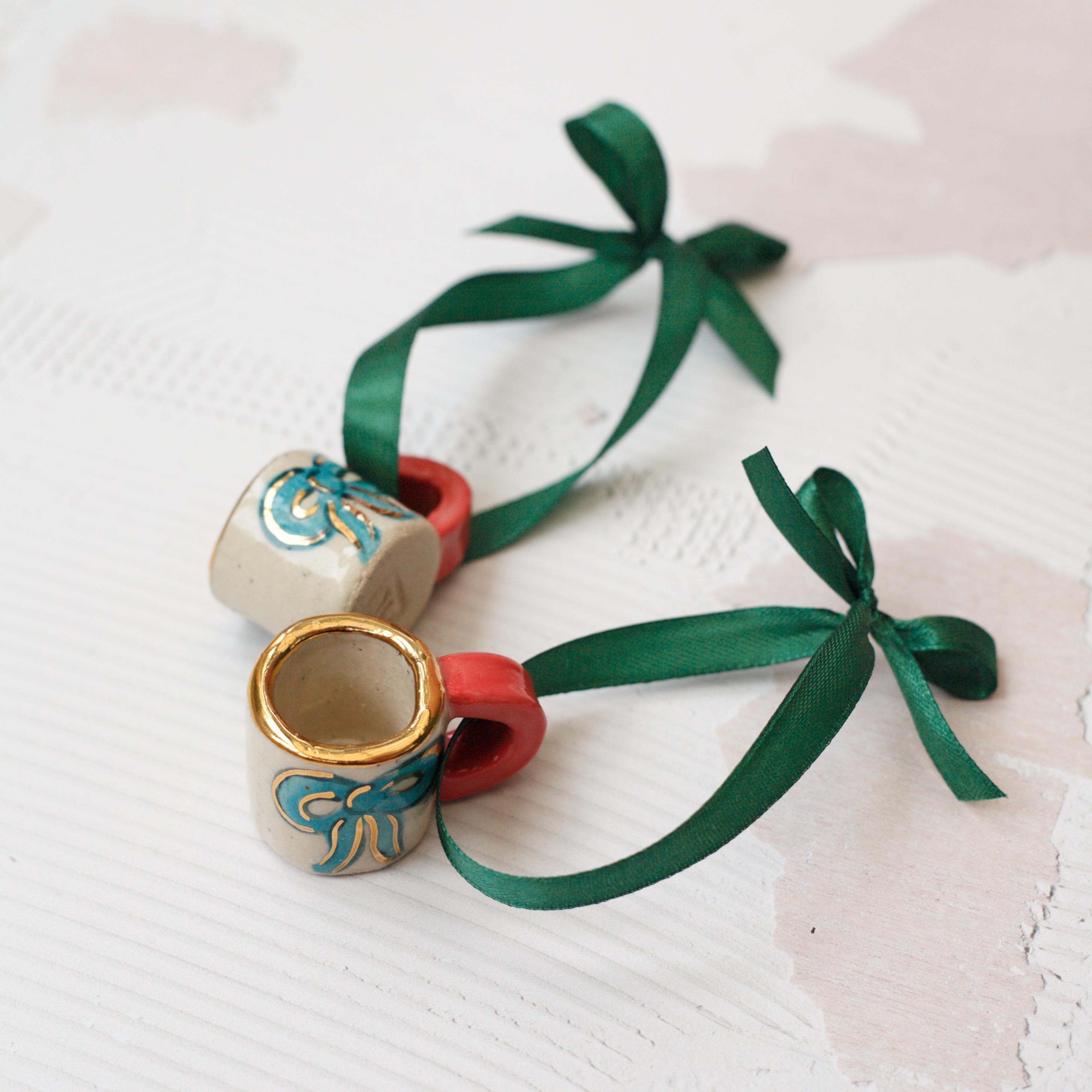 Mini ornamental ceramic mug for the Christmas tree featuring a vibrant hand-painted design. Finished with genuine gold lustre accents, this unique piece can add a festive touch to your tree. It comes with a green ribbon for easy hanging, making it perfect for the holidays or as a year-round decorative accent.