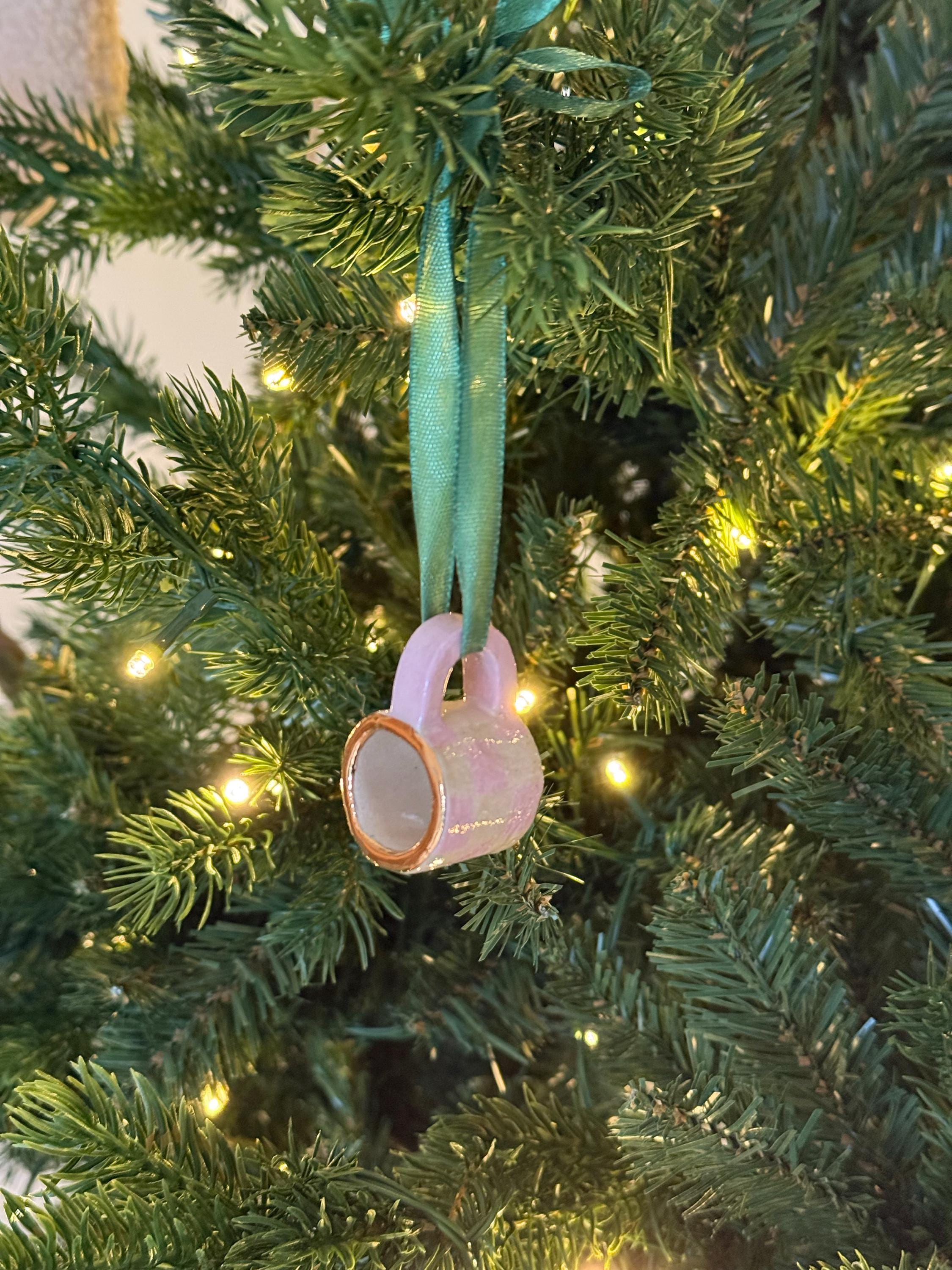 Mini ornamental ceramic mug for the Christmas tree featuring a vibrant hand-painted design. Finished with genuine gold lustre accents, this unique piece can add a festive touch to your tree. It comes with a green ribbon for easy hanging, making it perfect for the holidays or as a year-round decorative accent.