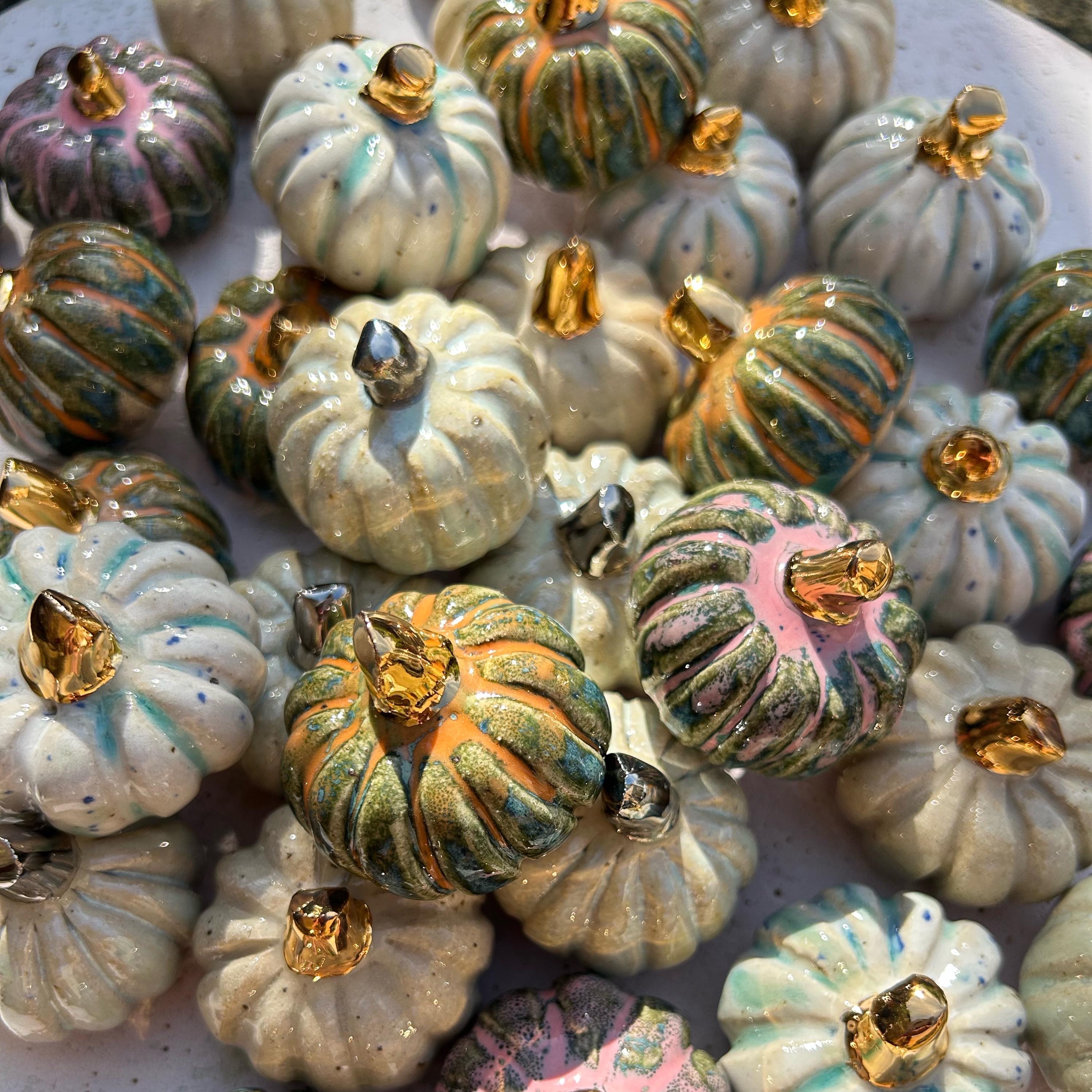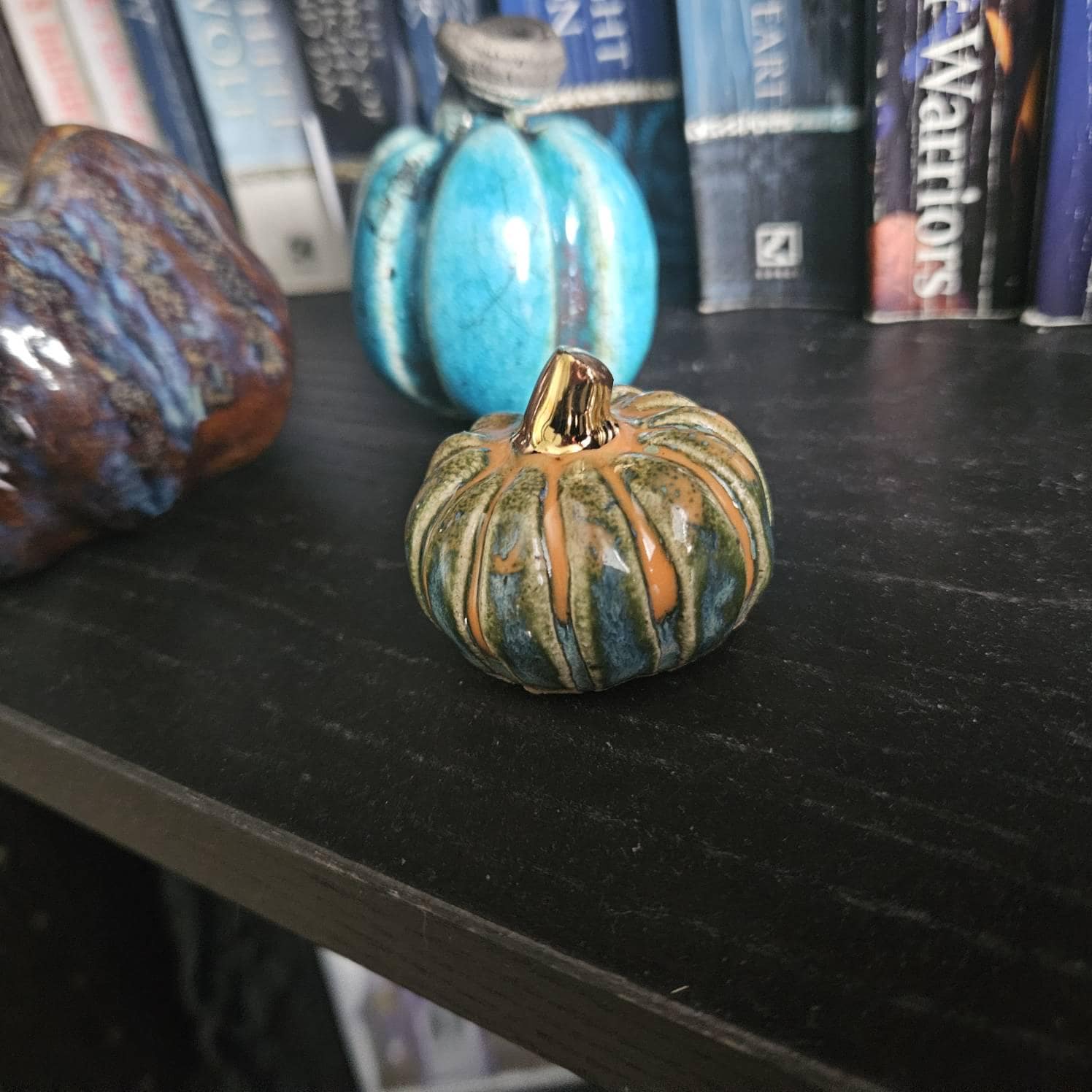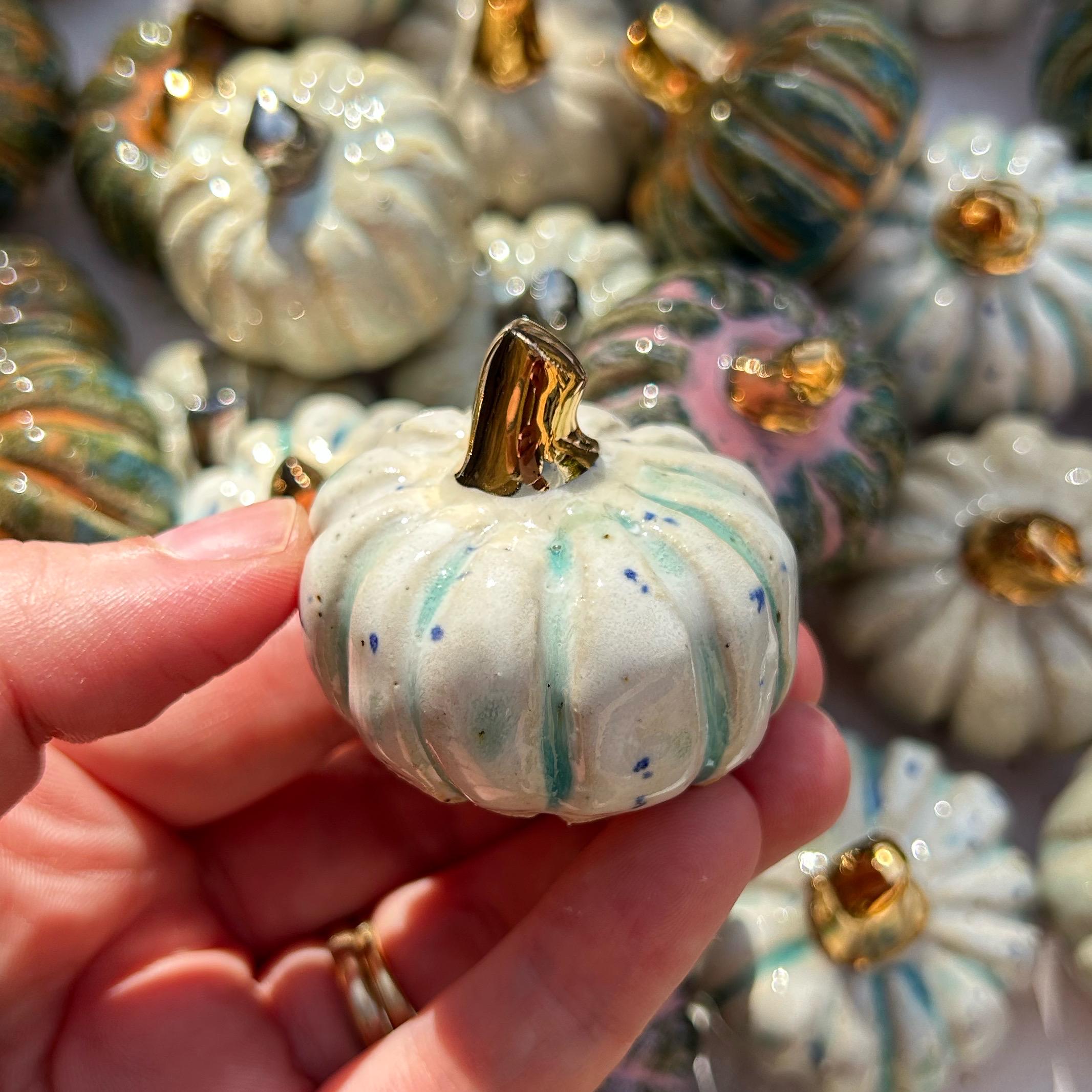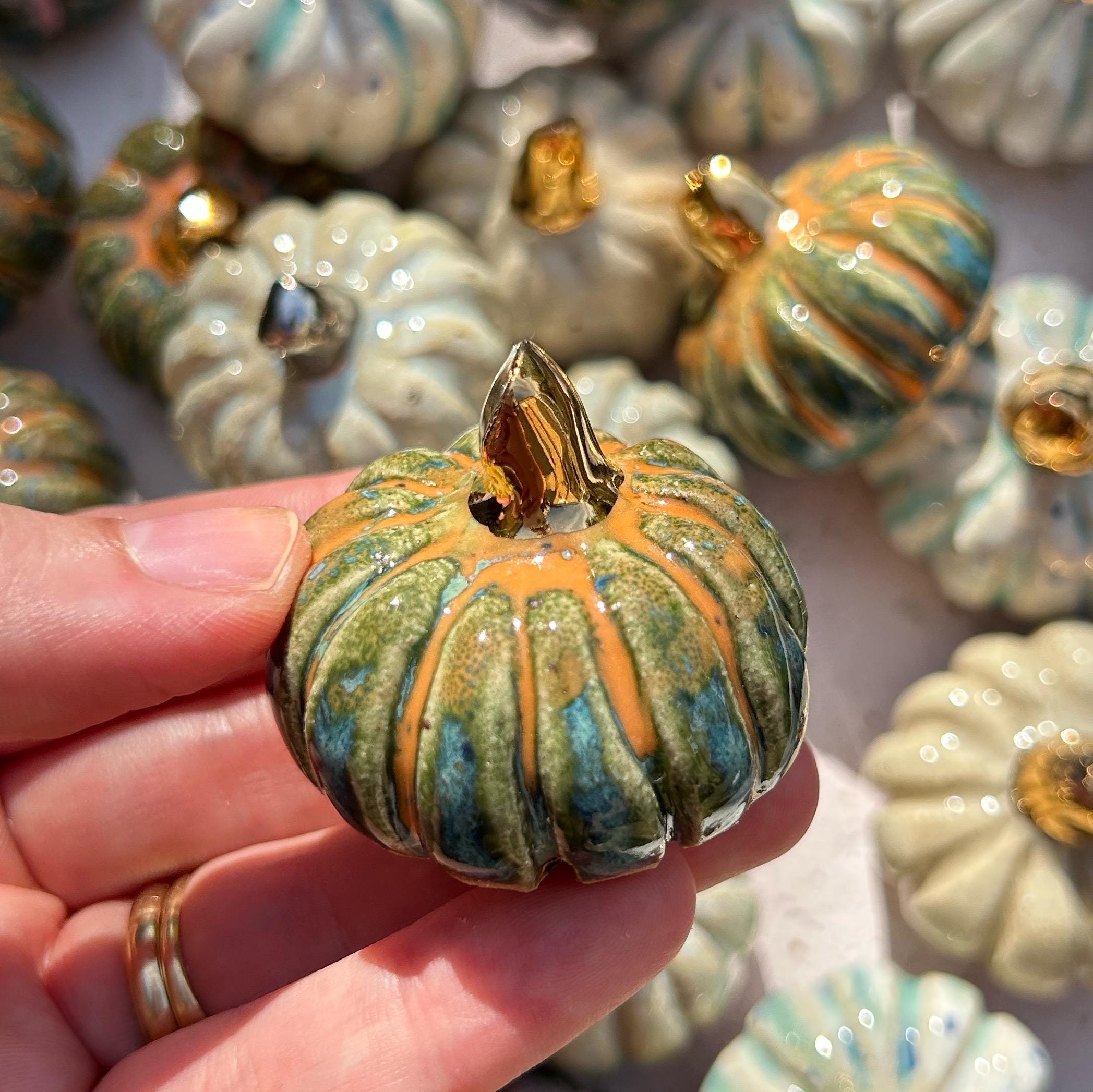 Handmade Ceramic Pumpkin with Gold Lustre Stem available in various colour glazes.