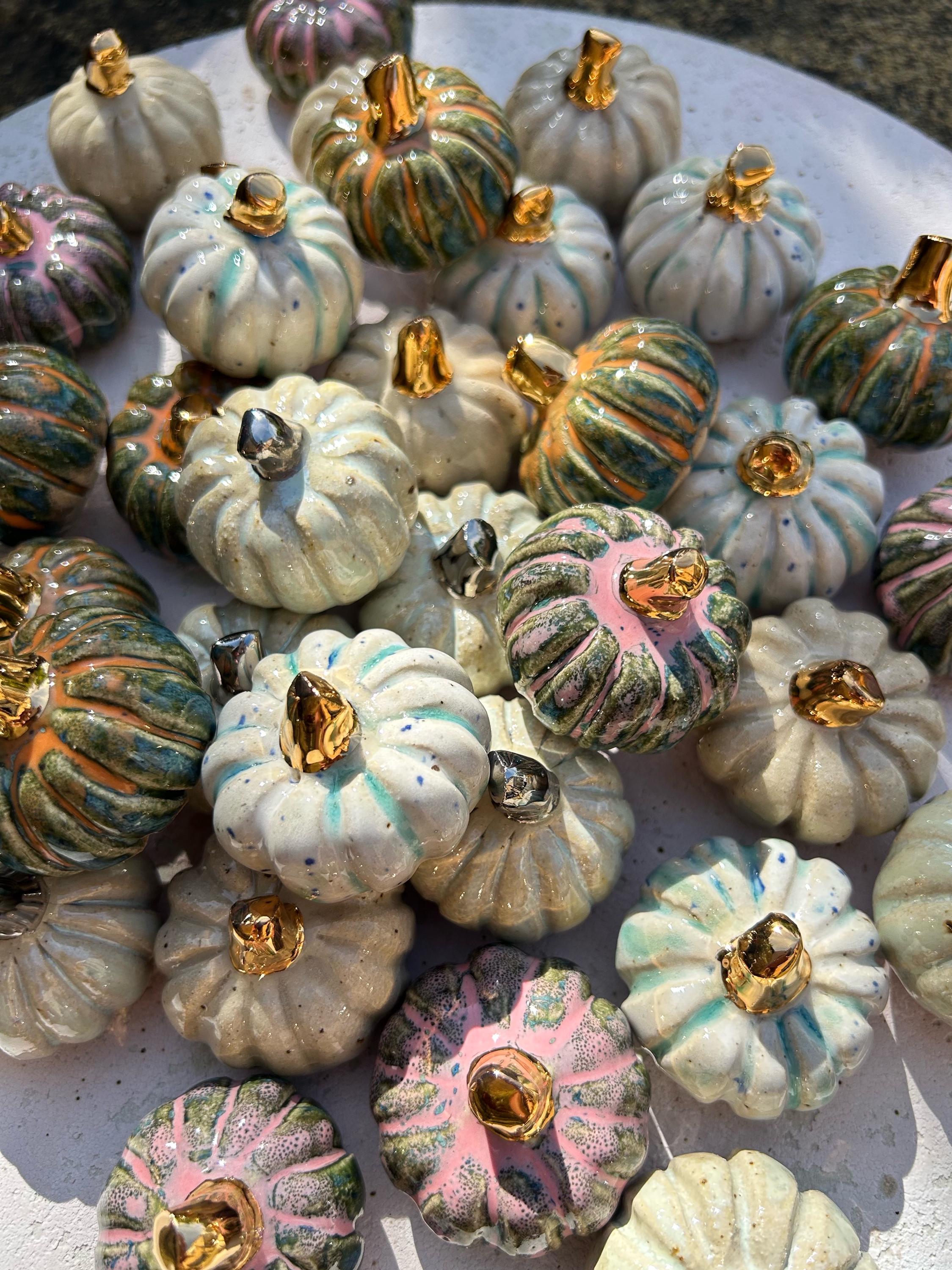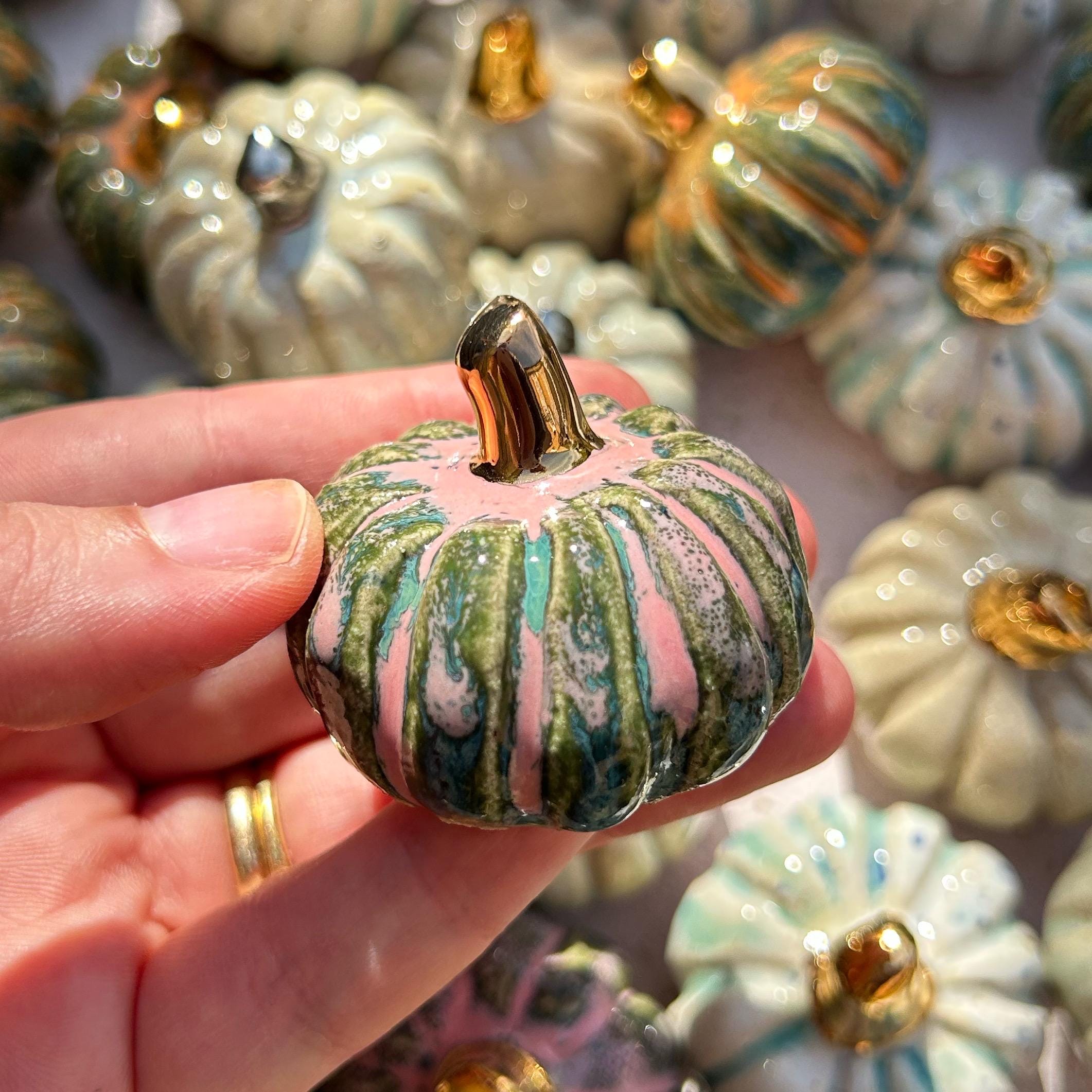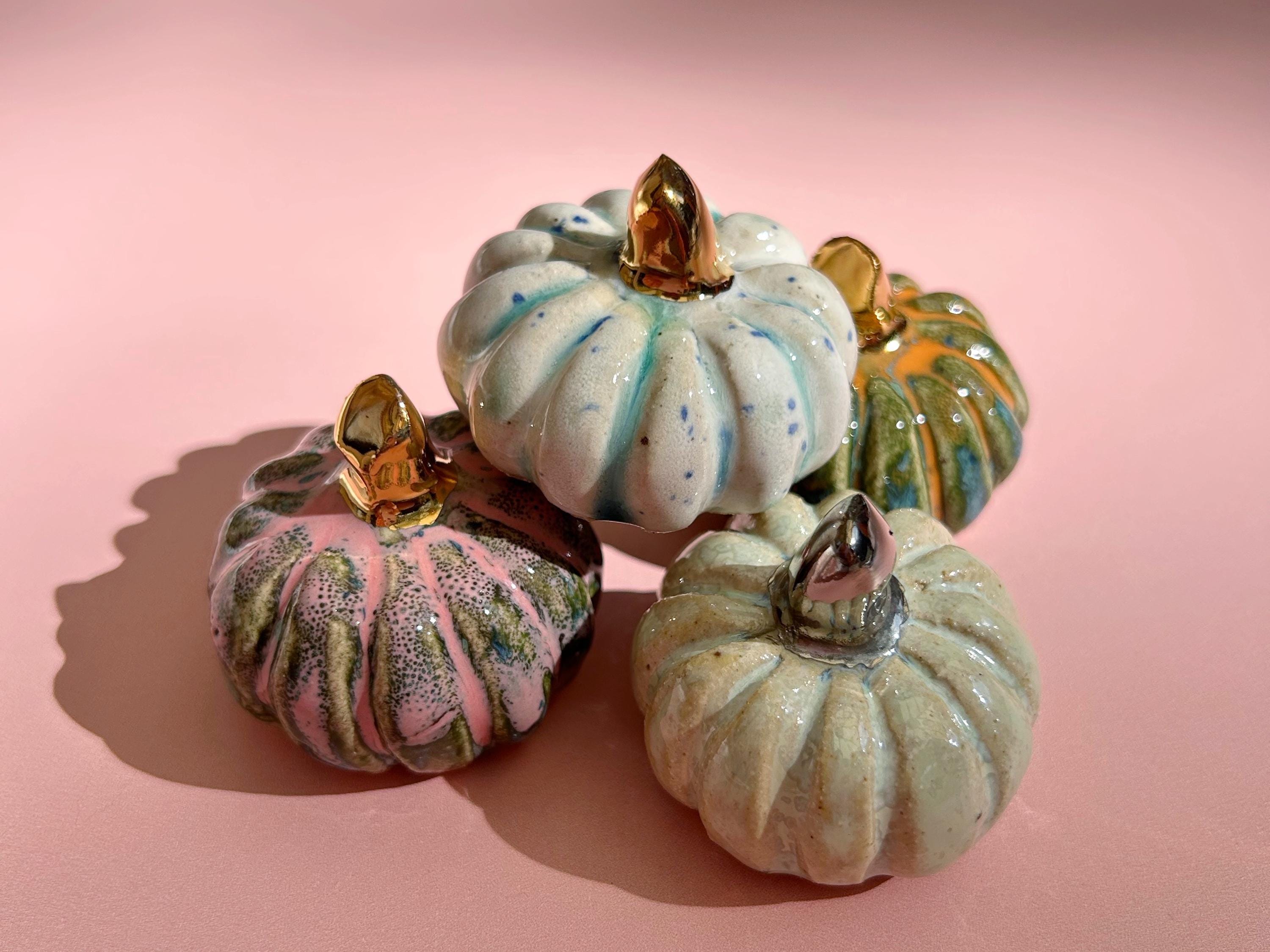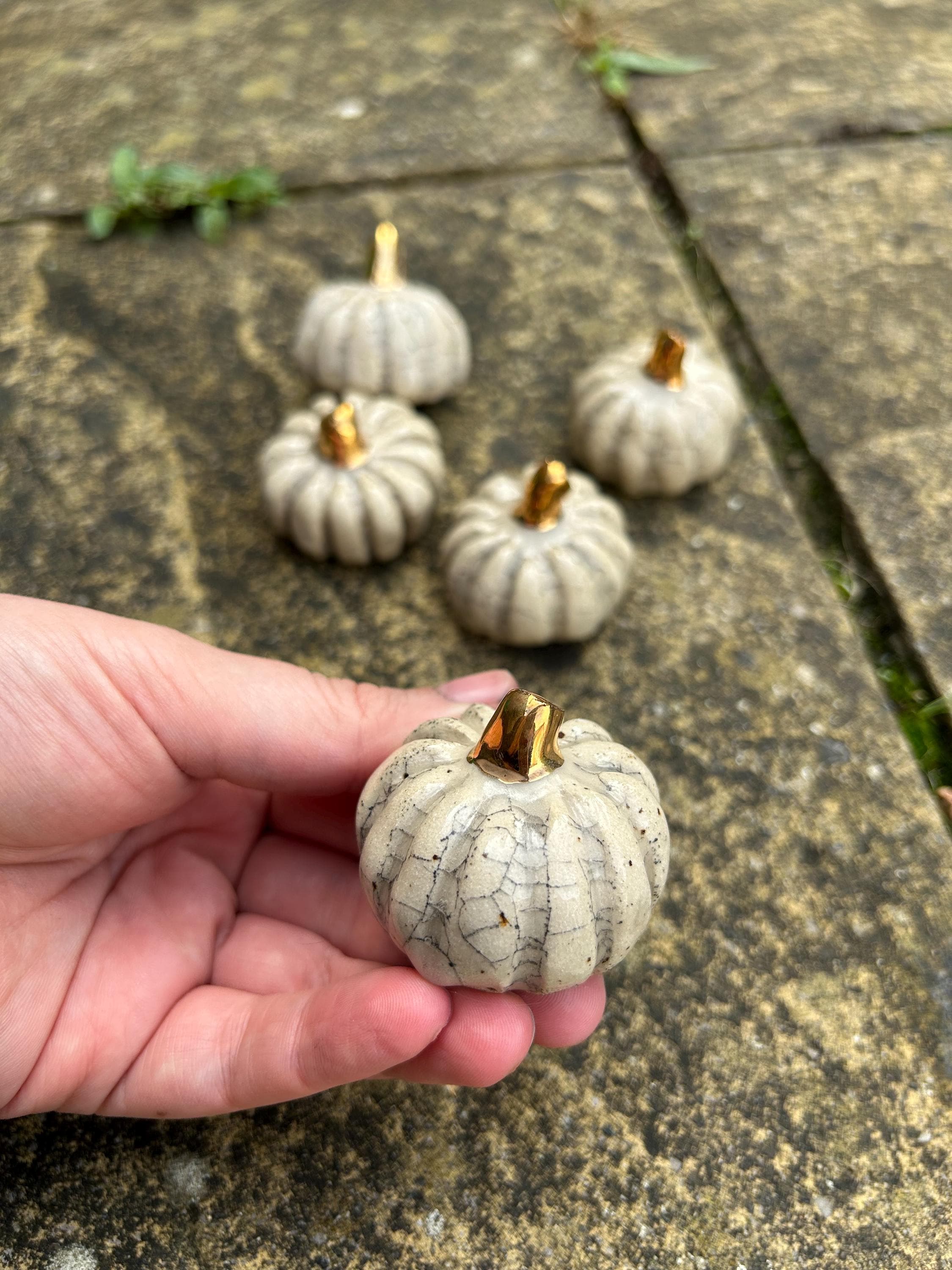 Handmade Ceramic Pumpkin with Gold Lustre Stem available in various colour glazes.