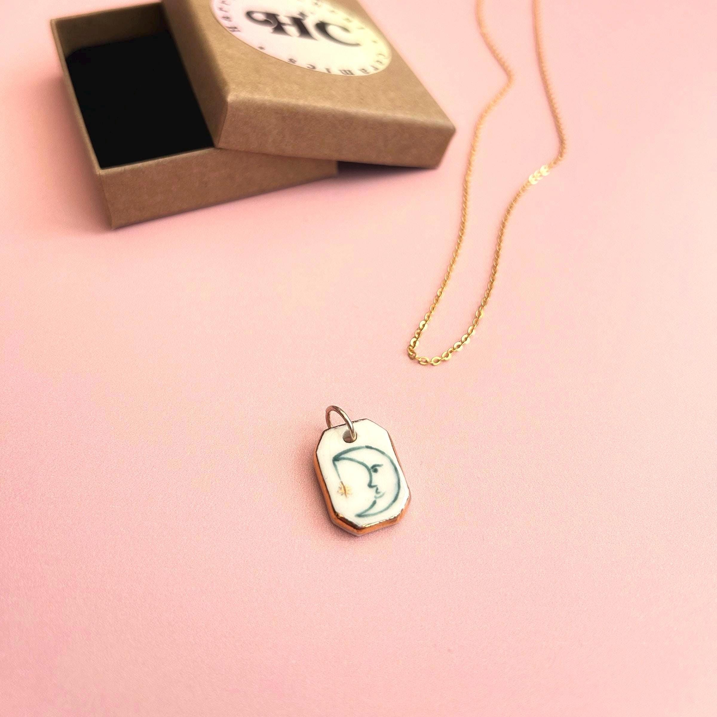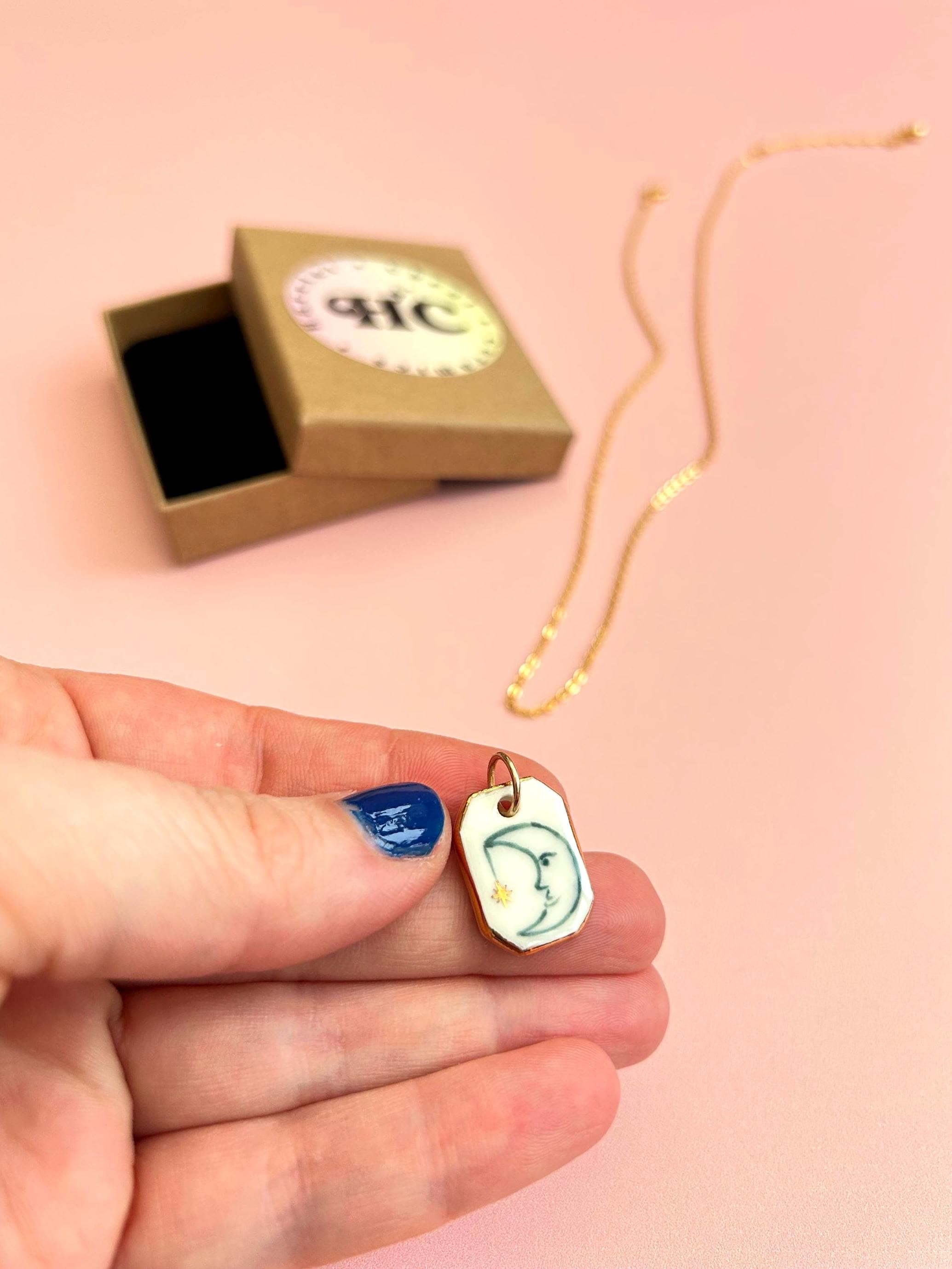 This porcelain pendant is hand painted and finished with genuine gold lustre along the edges. Each charm comes with a gold plated brass jump ring, ready to add to your own necklace.