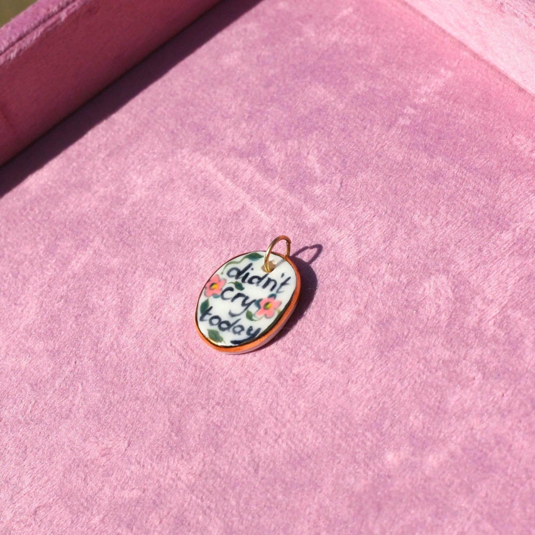 Handmade with care, this porcelain pendant is hand-painted and finished with a touch of genuine gold lustre along the edges for a subtle shine. Each charm comes fitted with a gold-filled brass jump ring, ready to be added to your own necklace.
