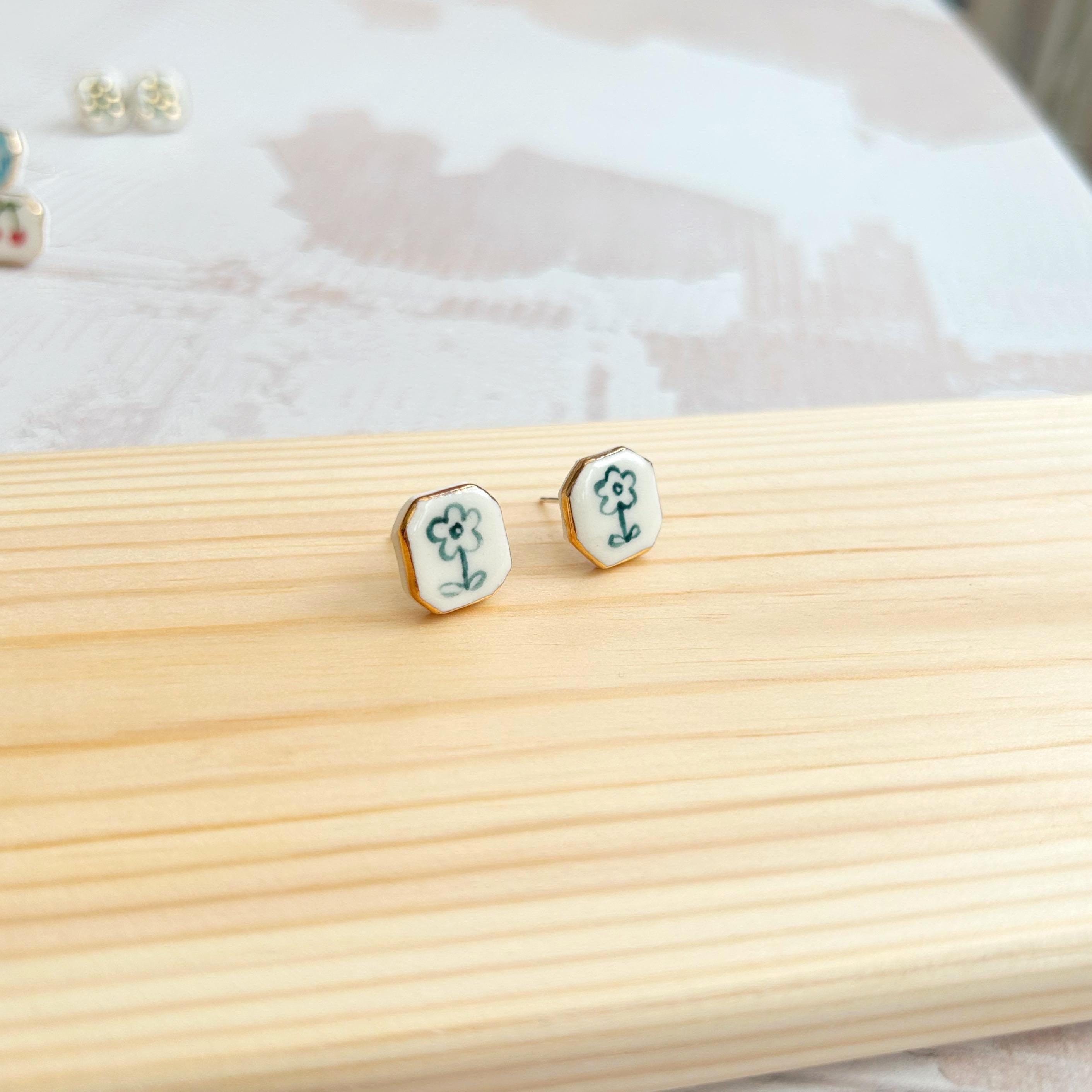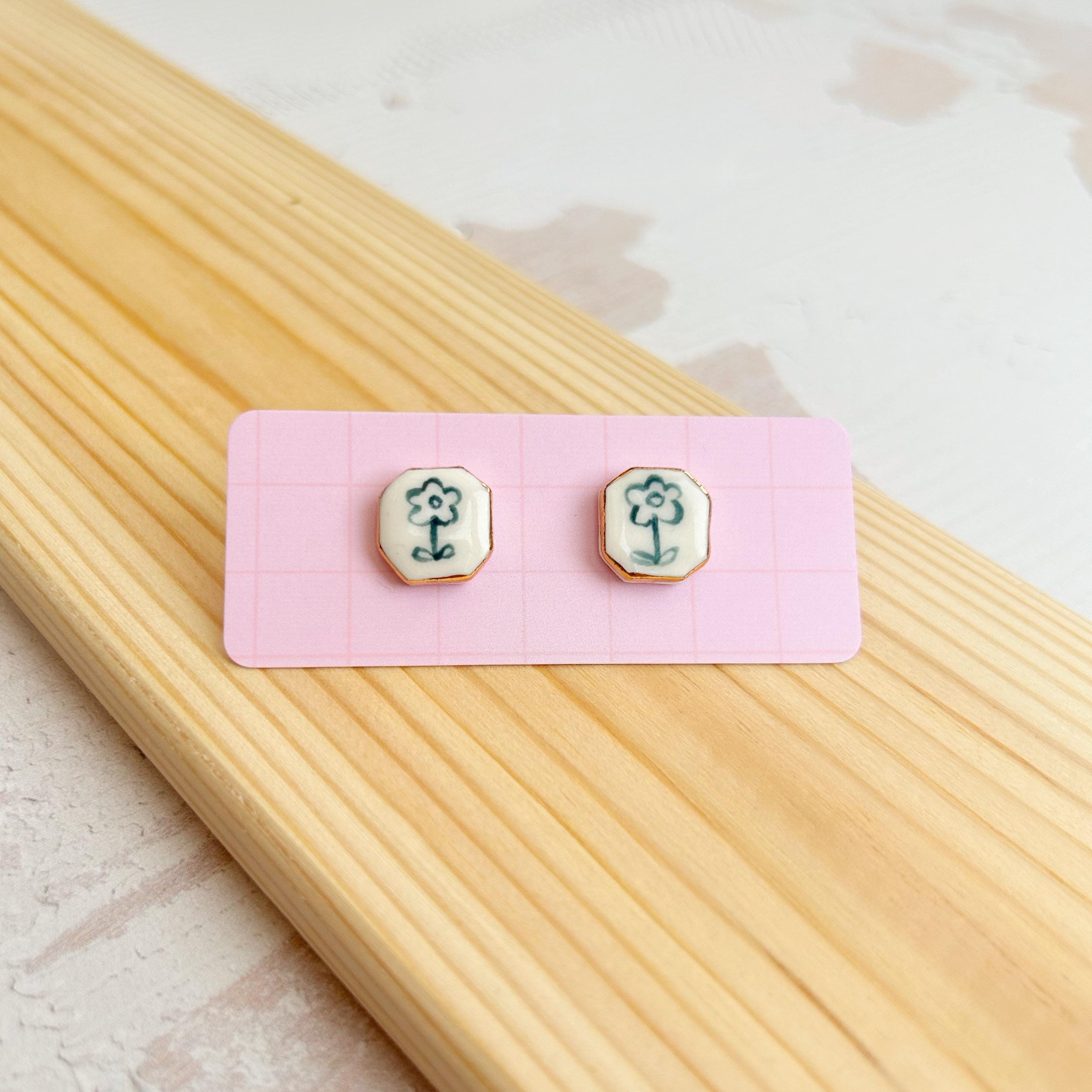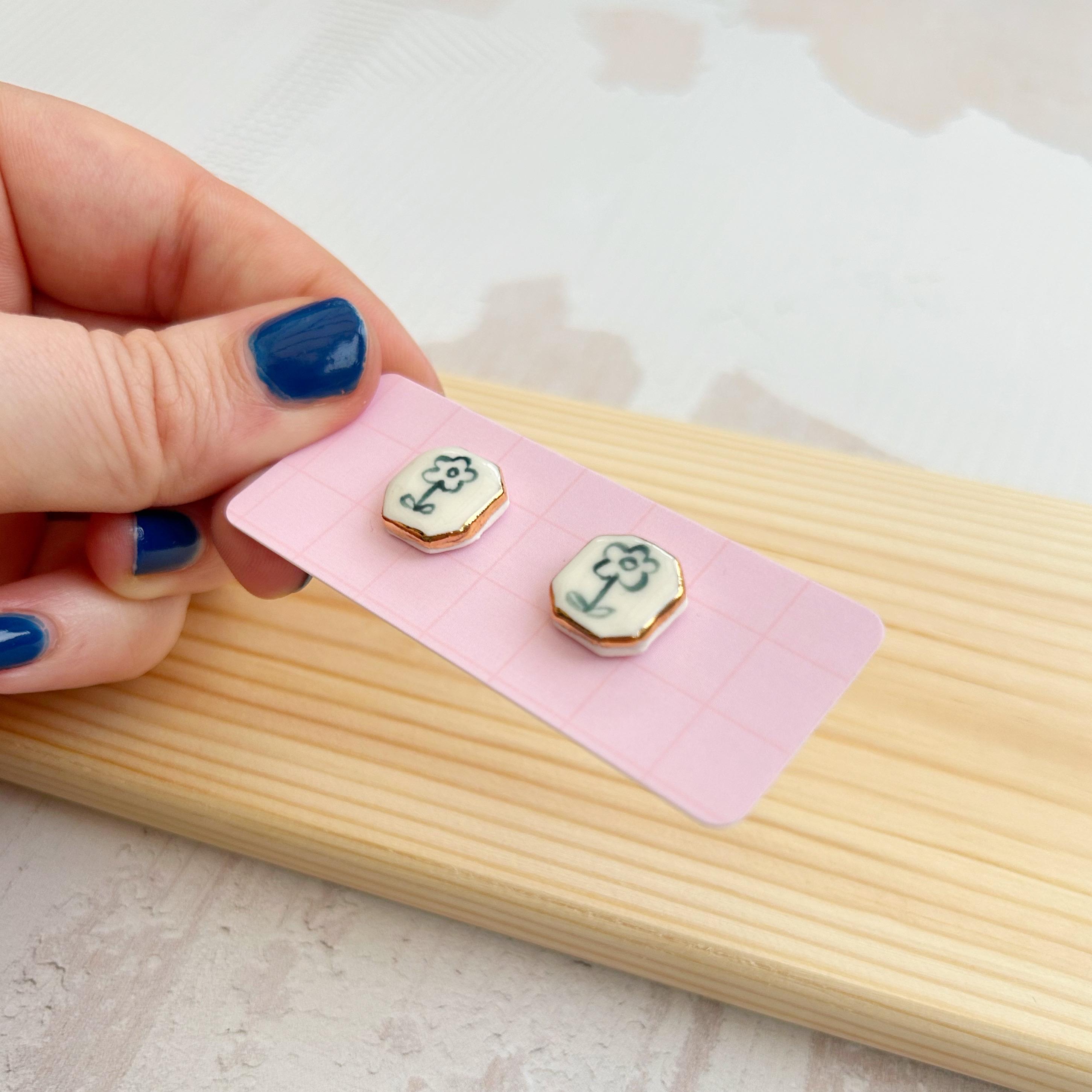 These handcrafted porcelain stud earrings have a hand painted design. The earrings are finished with genuine gold lustre detailing, adding a subtle shine to the octagonal shape. Made with sterling silver posts, these lightweight and comfortable earrings are perfect for everyday wear or as a thoughtful gift.