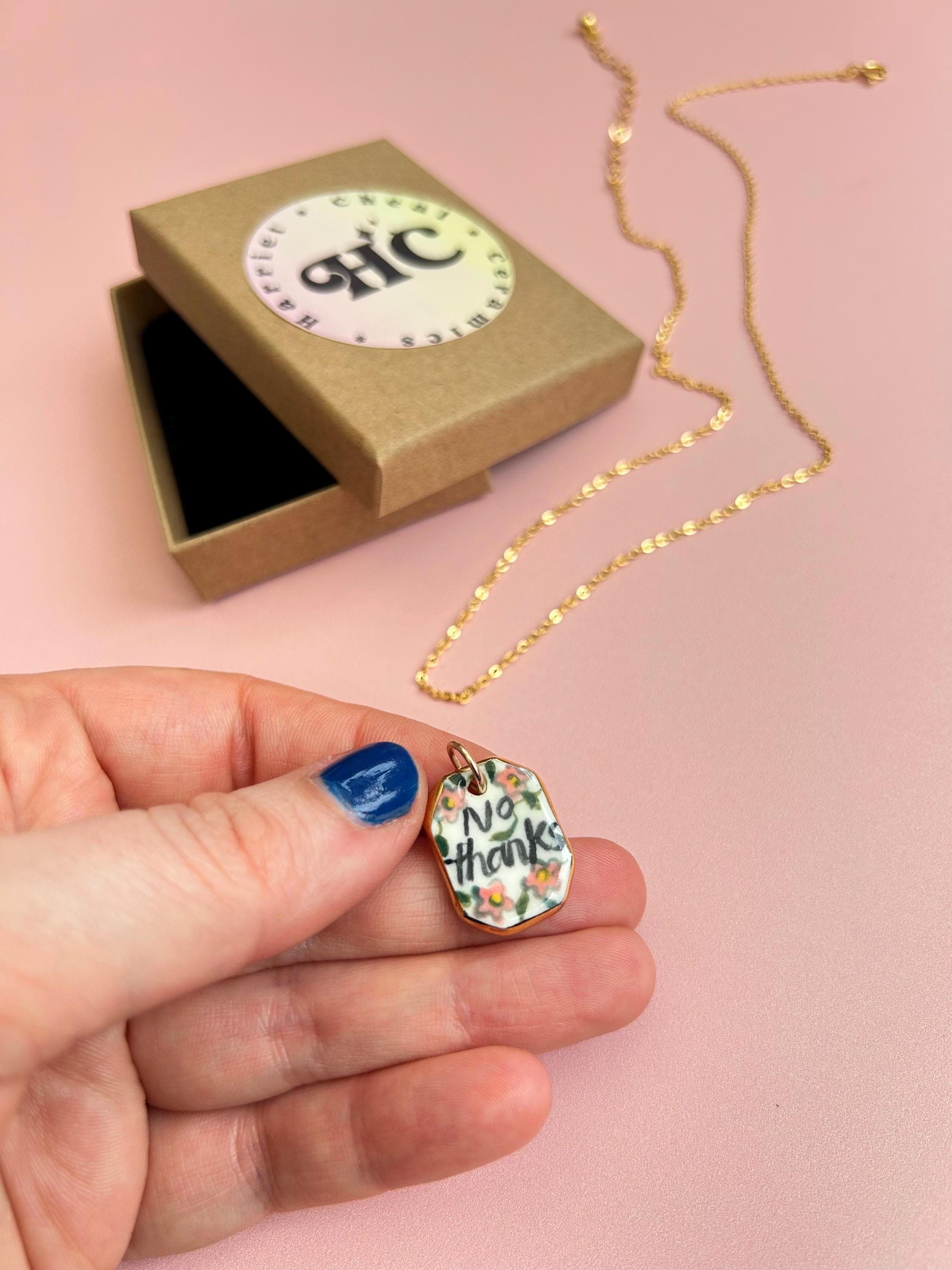 Hand Painted Pink Floral Ceramic Pendant, 'No thanks', Gold Luster Edge