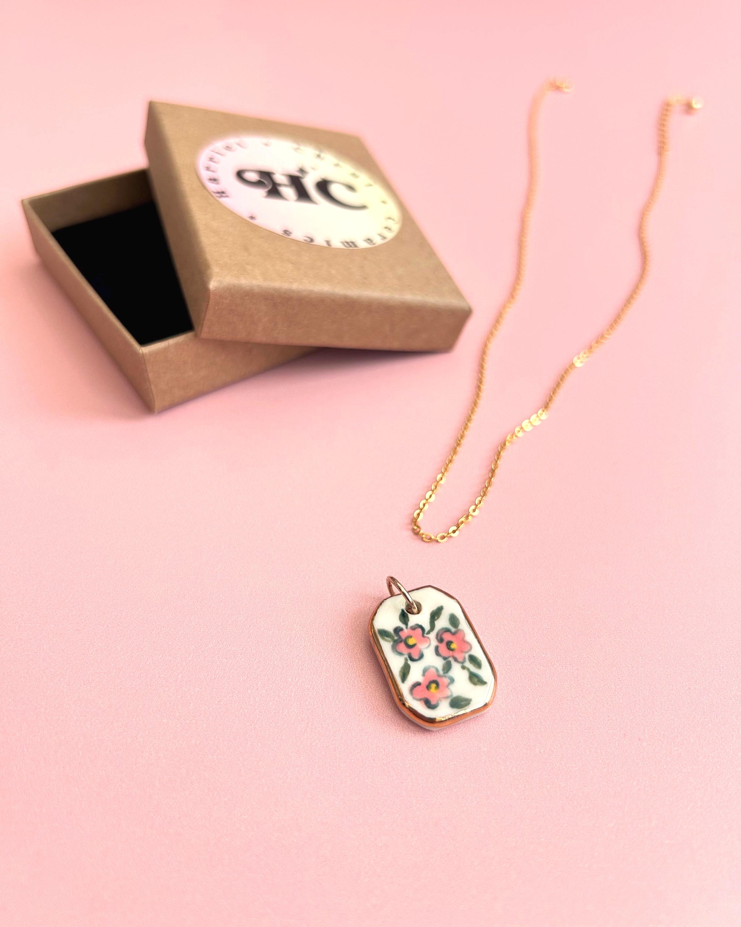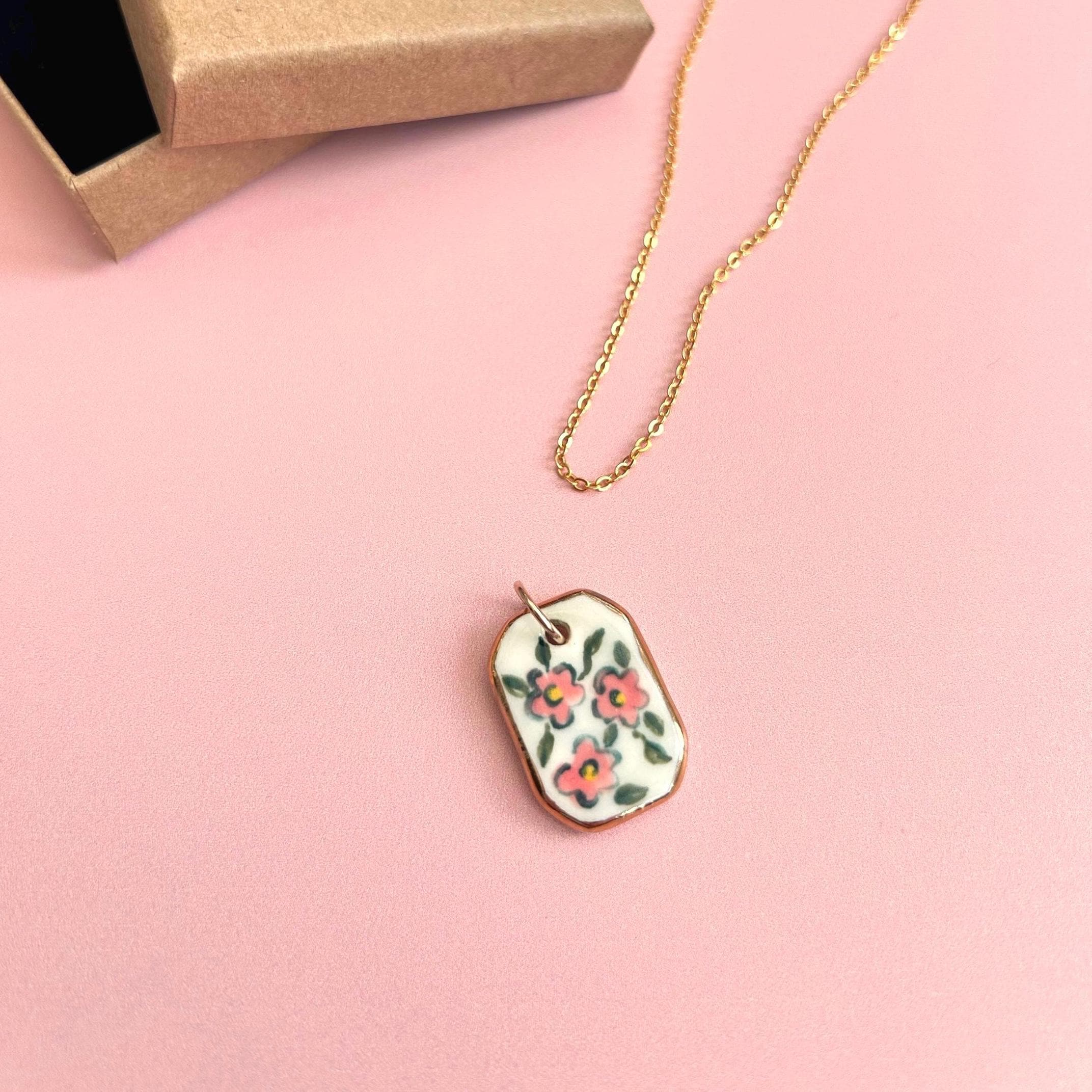 This porcelain pendant is hand painted with a pink floral design and finished with genuine gold lustre along the edges. Each charm comes with a gold plated brass jump ring, ready to add to your own necklace.