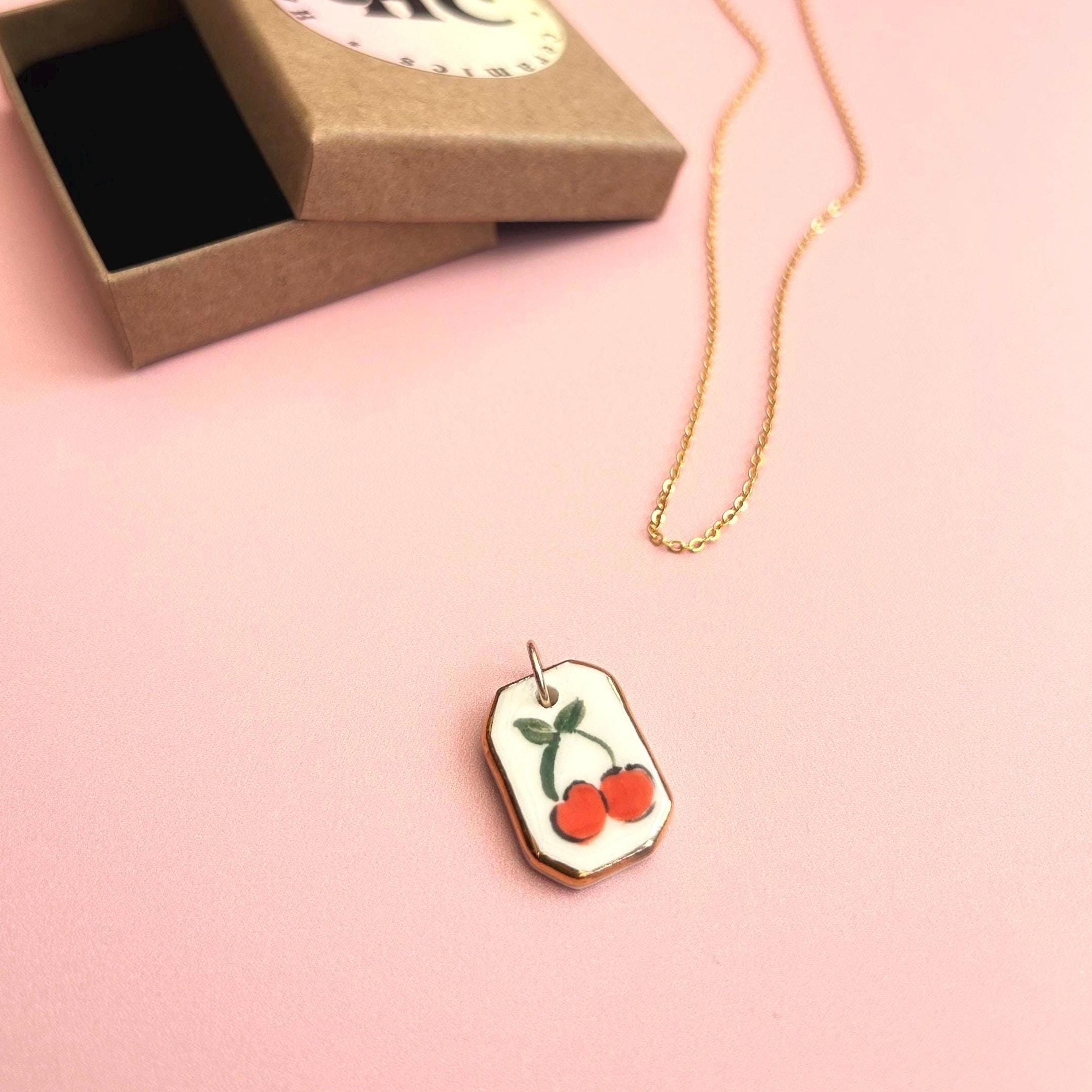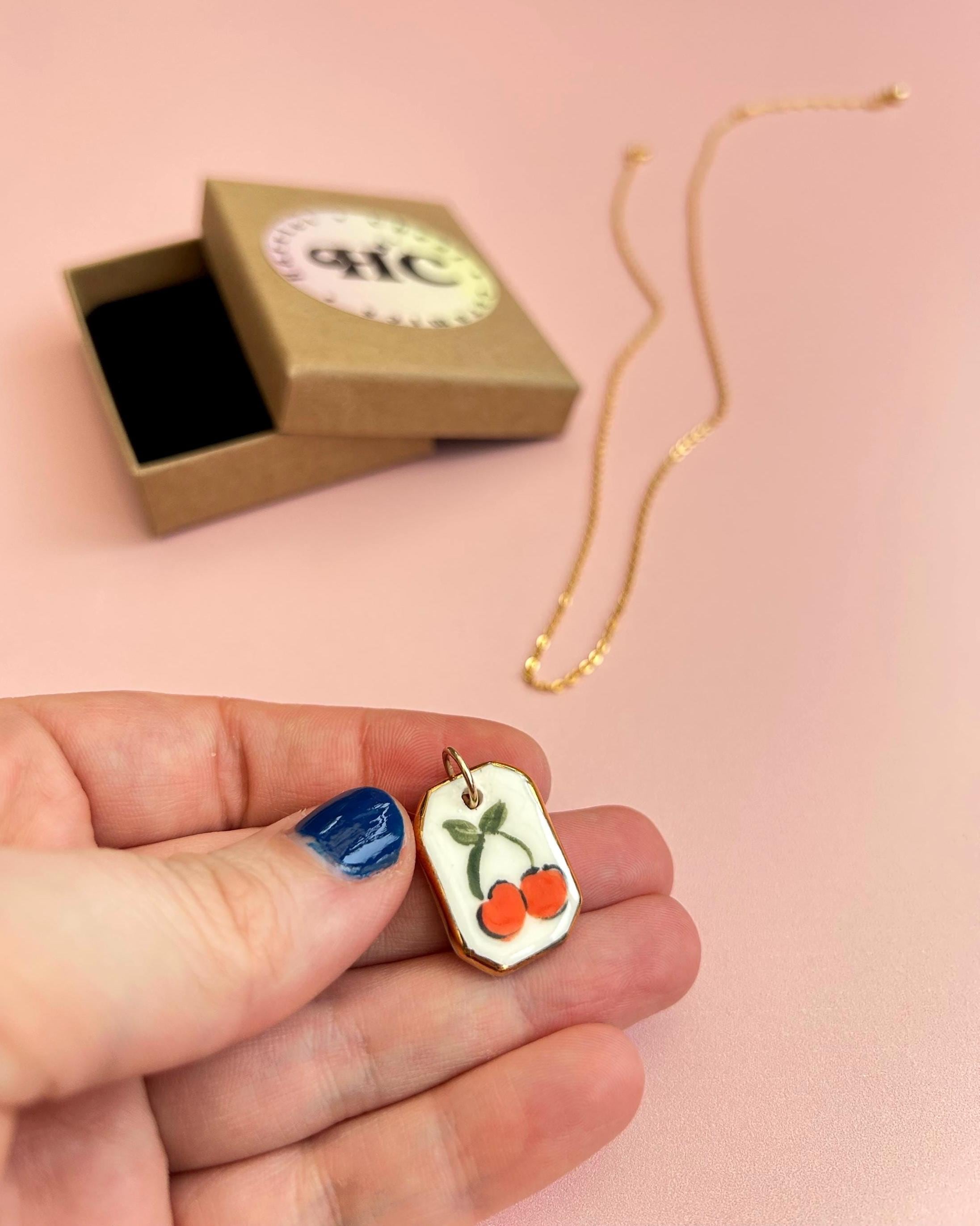 Handmade Ceramic Painted Cherry Pendant (2.1cm): Gold Lustre Edge