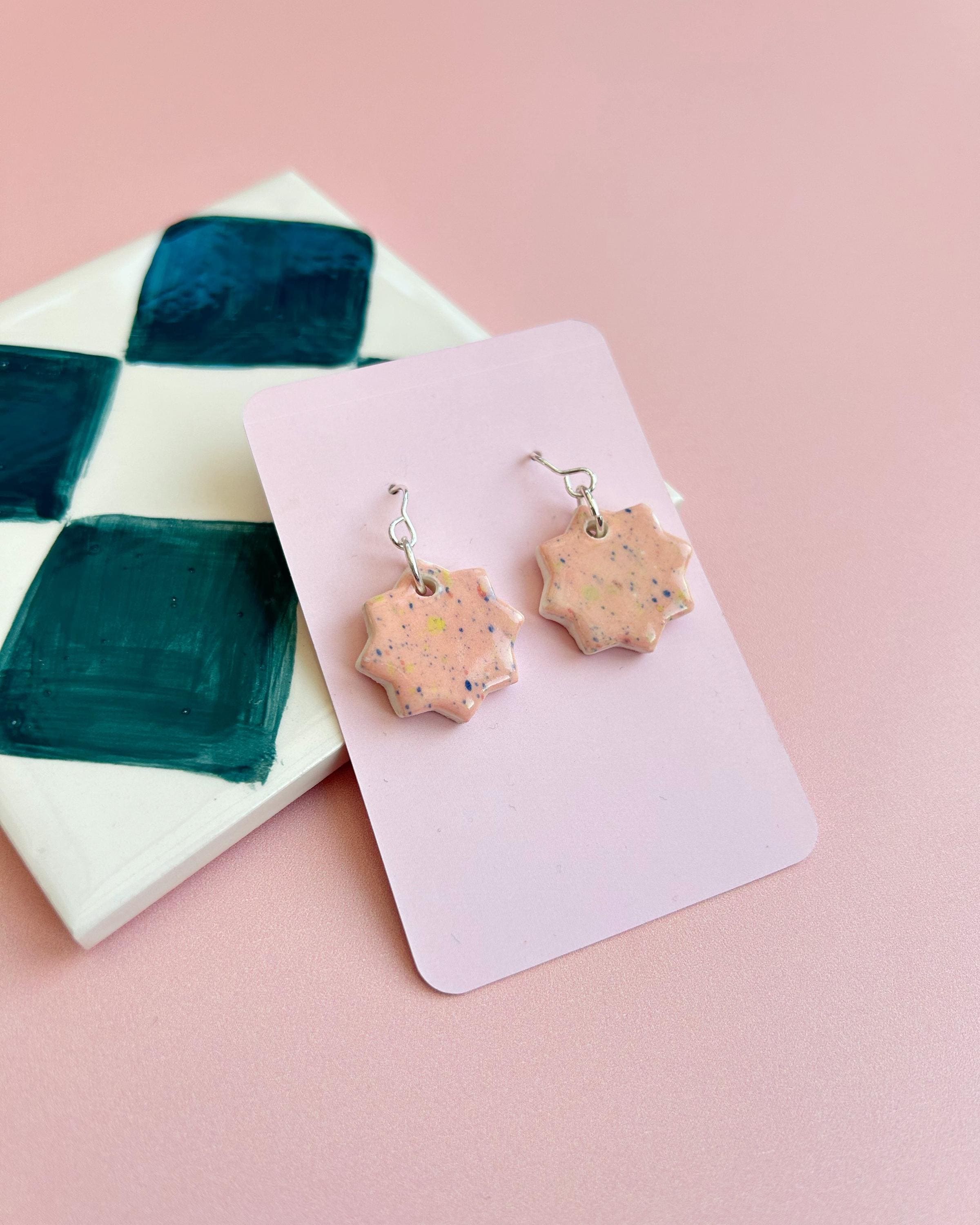 Handmade Ceramic Earrings - Hand-Painted Star Drop Earrings with Sterling Silver Hooks