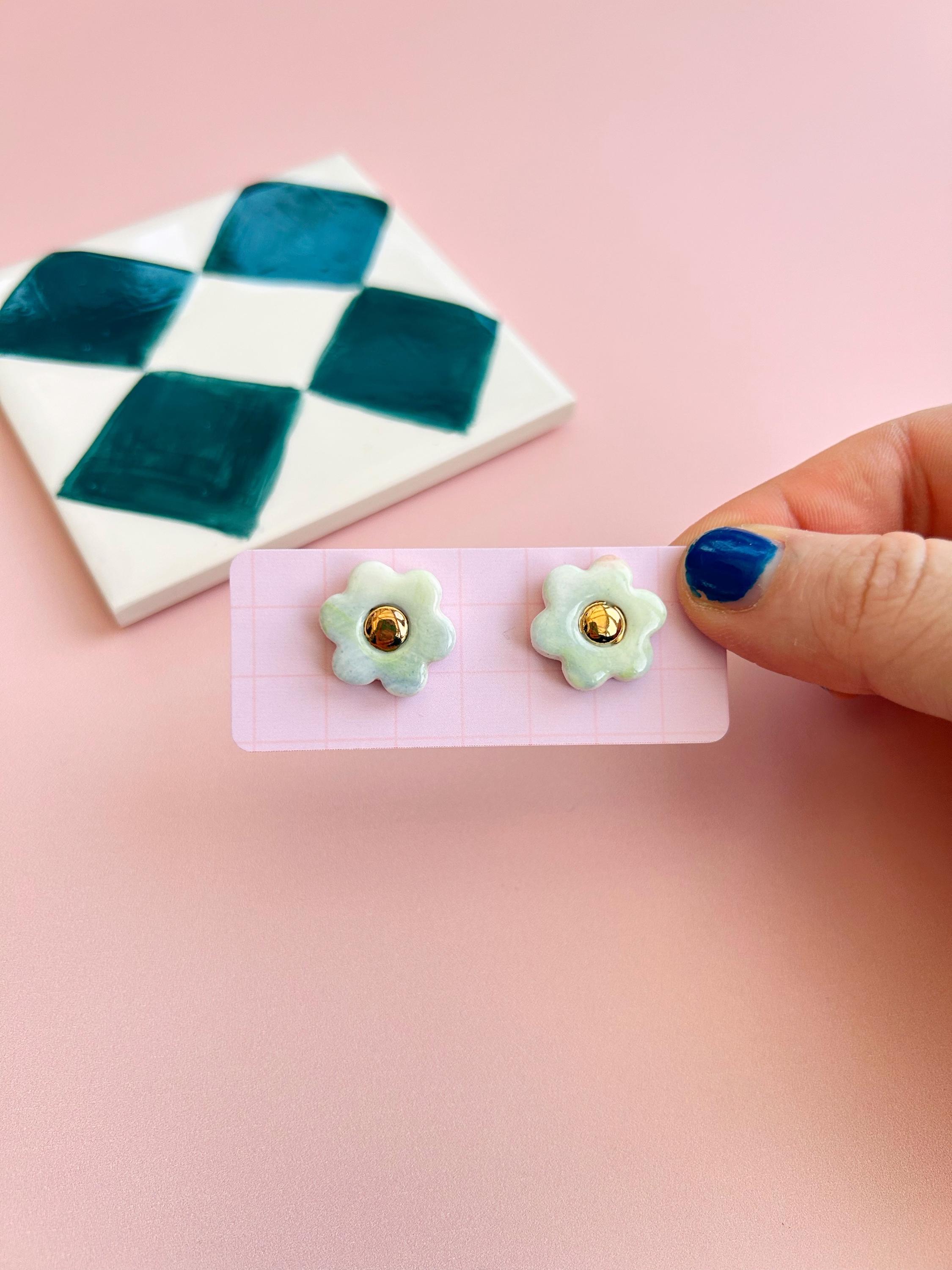 Hand-Painted ceramic Flower Stud Earrings with Gold Lustre and Sterling Silver Posts