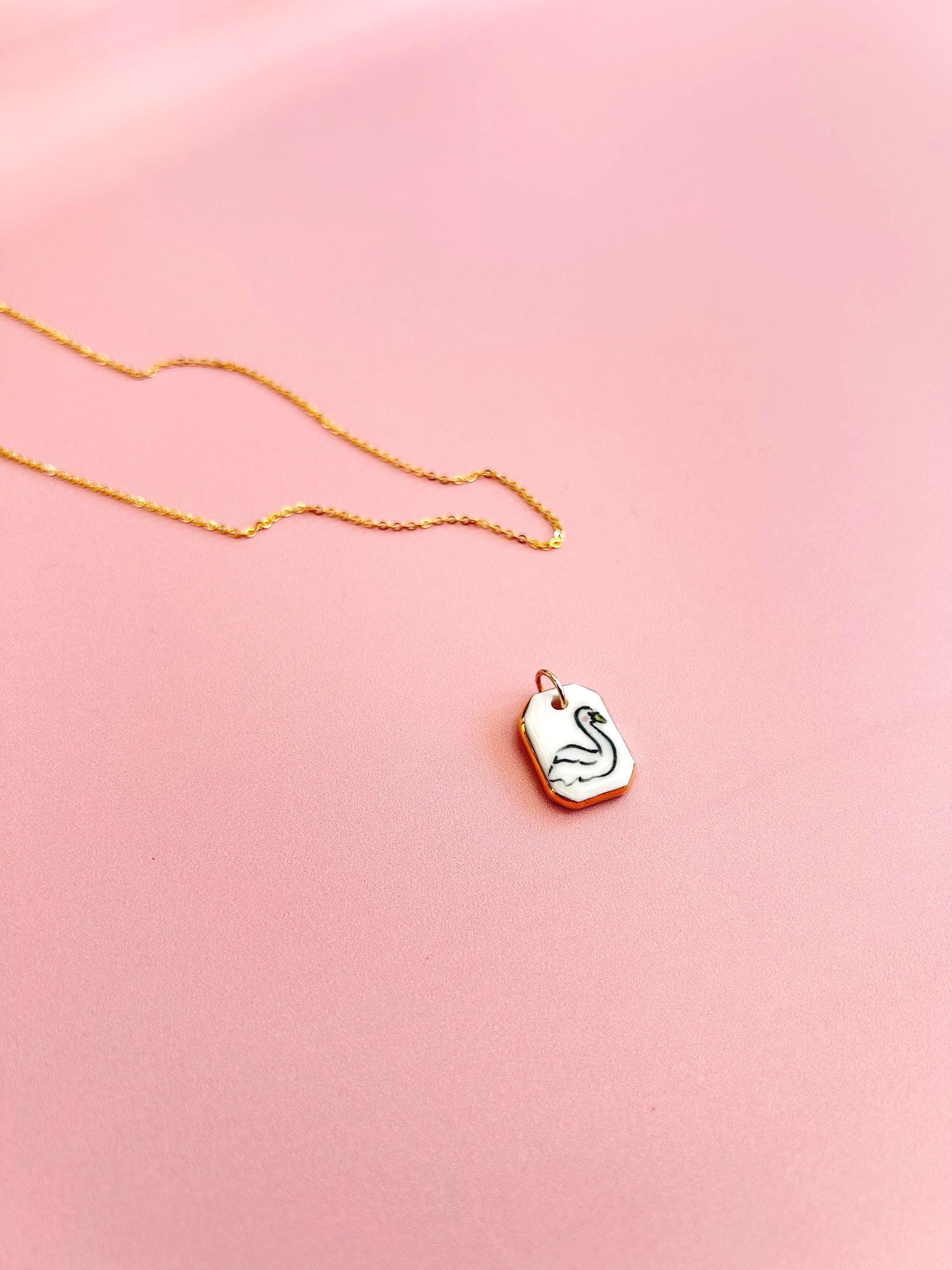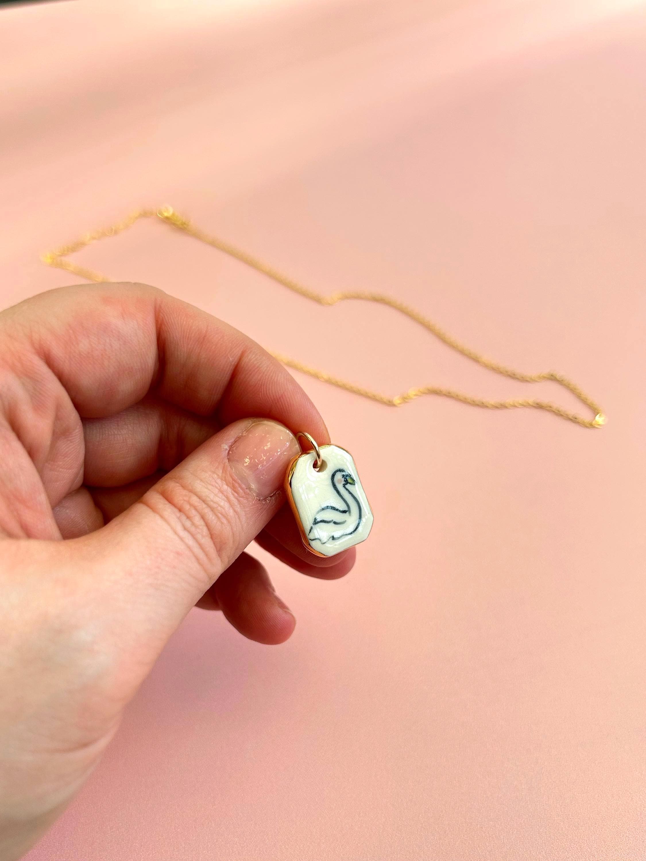 Hand-Painted swan Porcelain Pendant with Gold Lustre:
