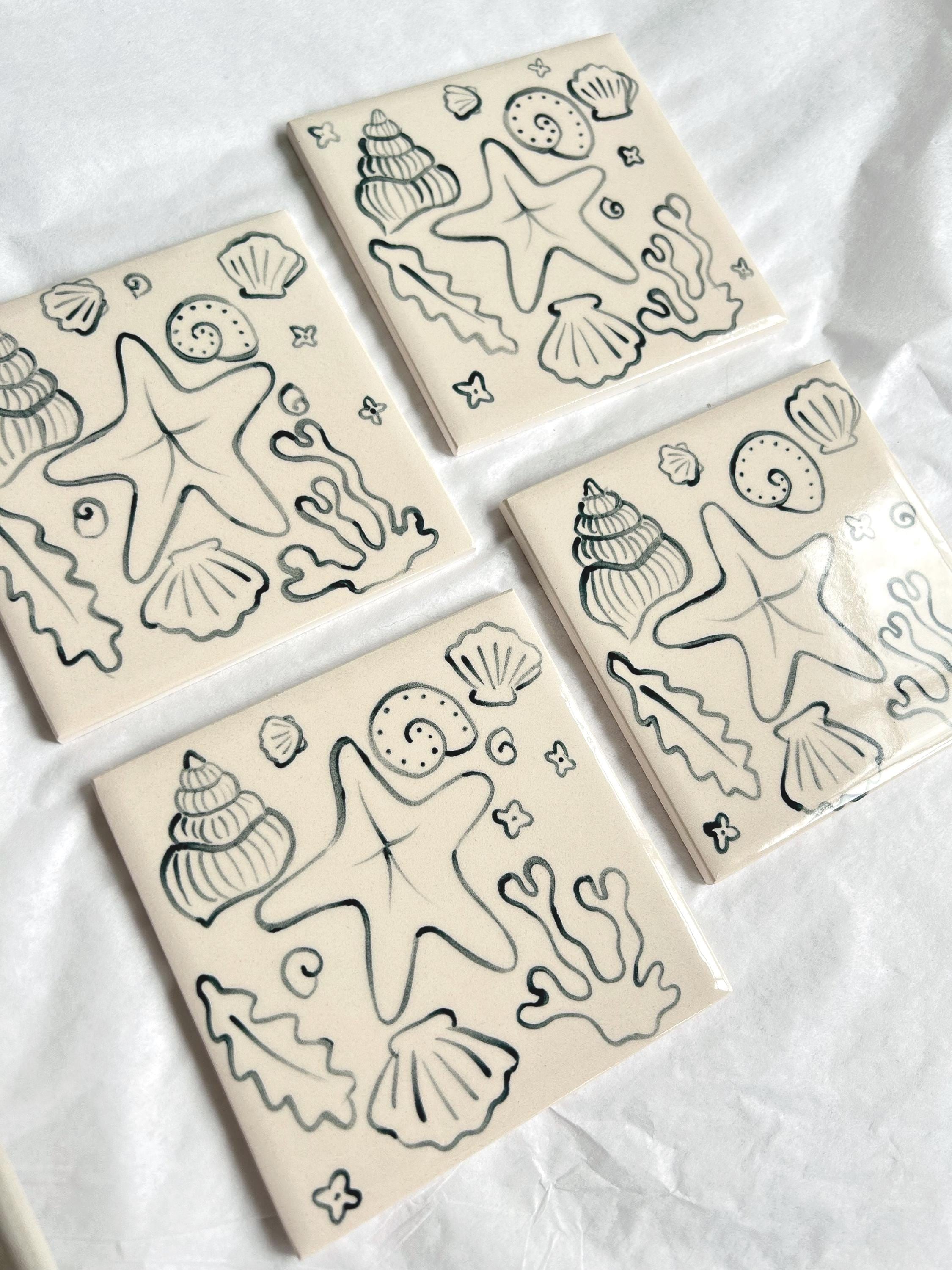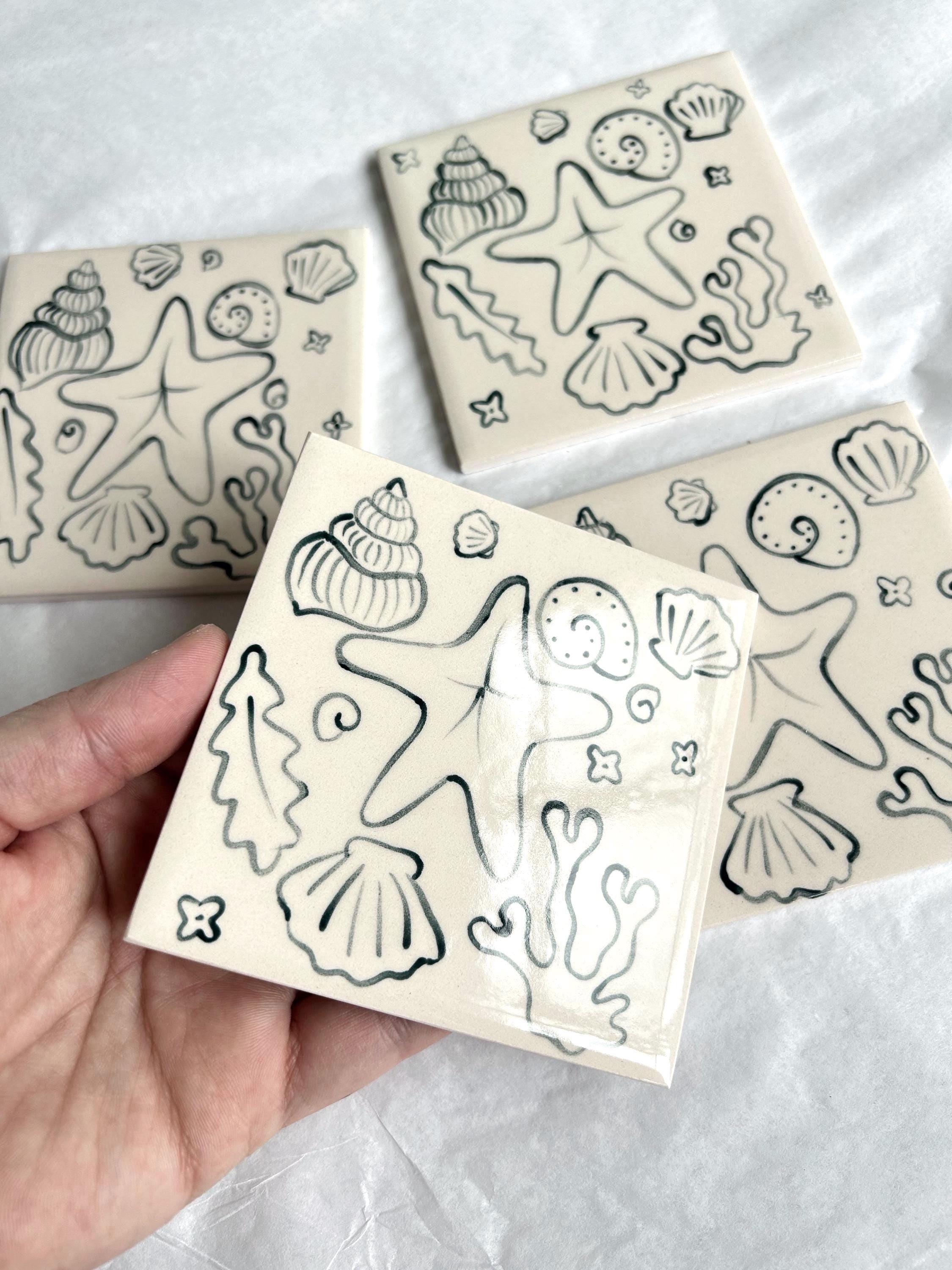 Hand Painted Ceramic Tile Coaster: Sea Shell Illustration