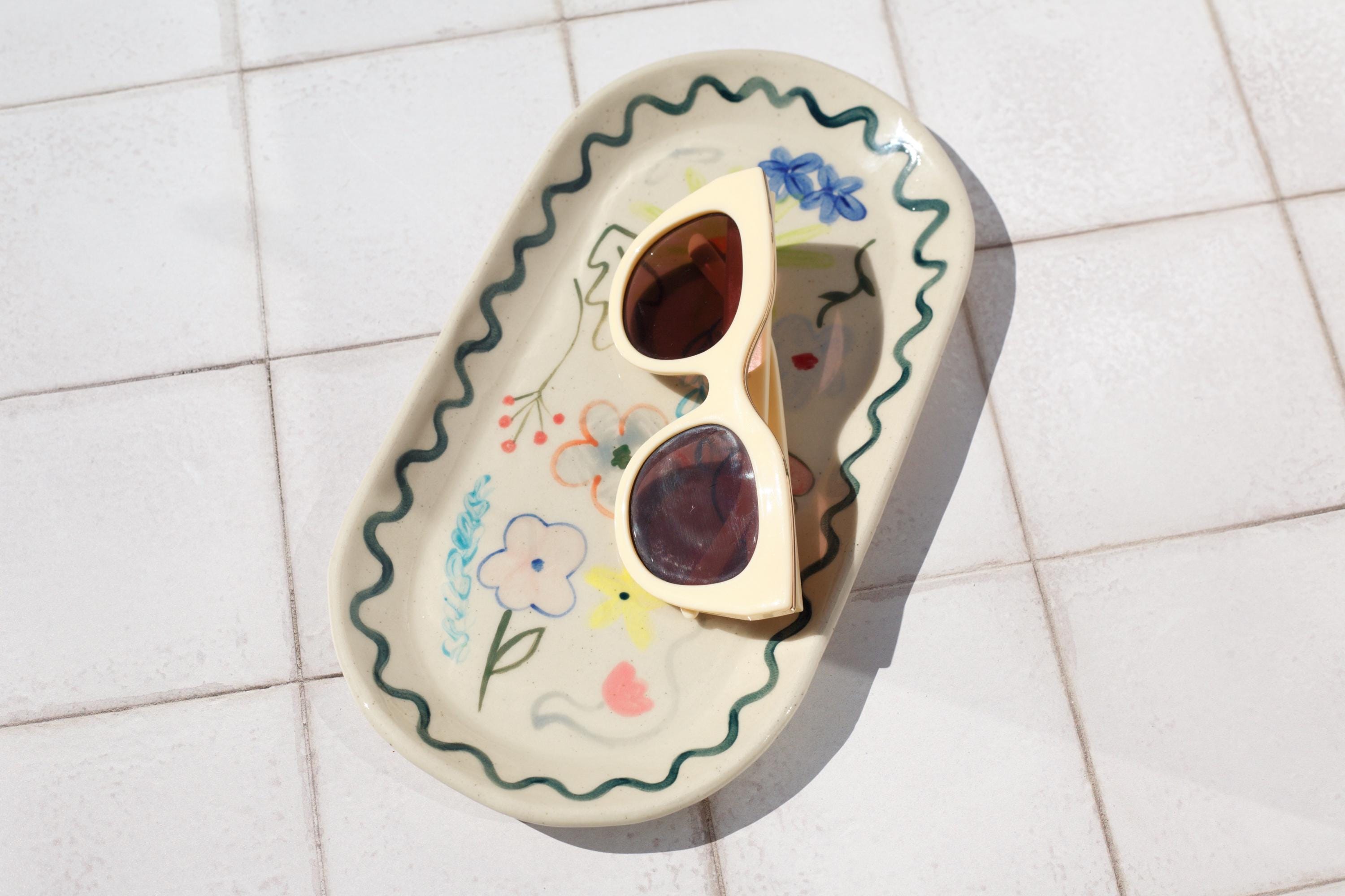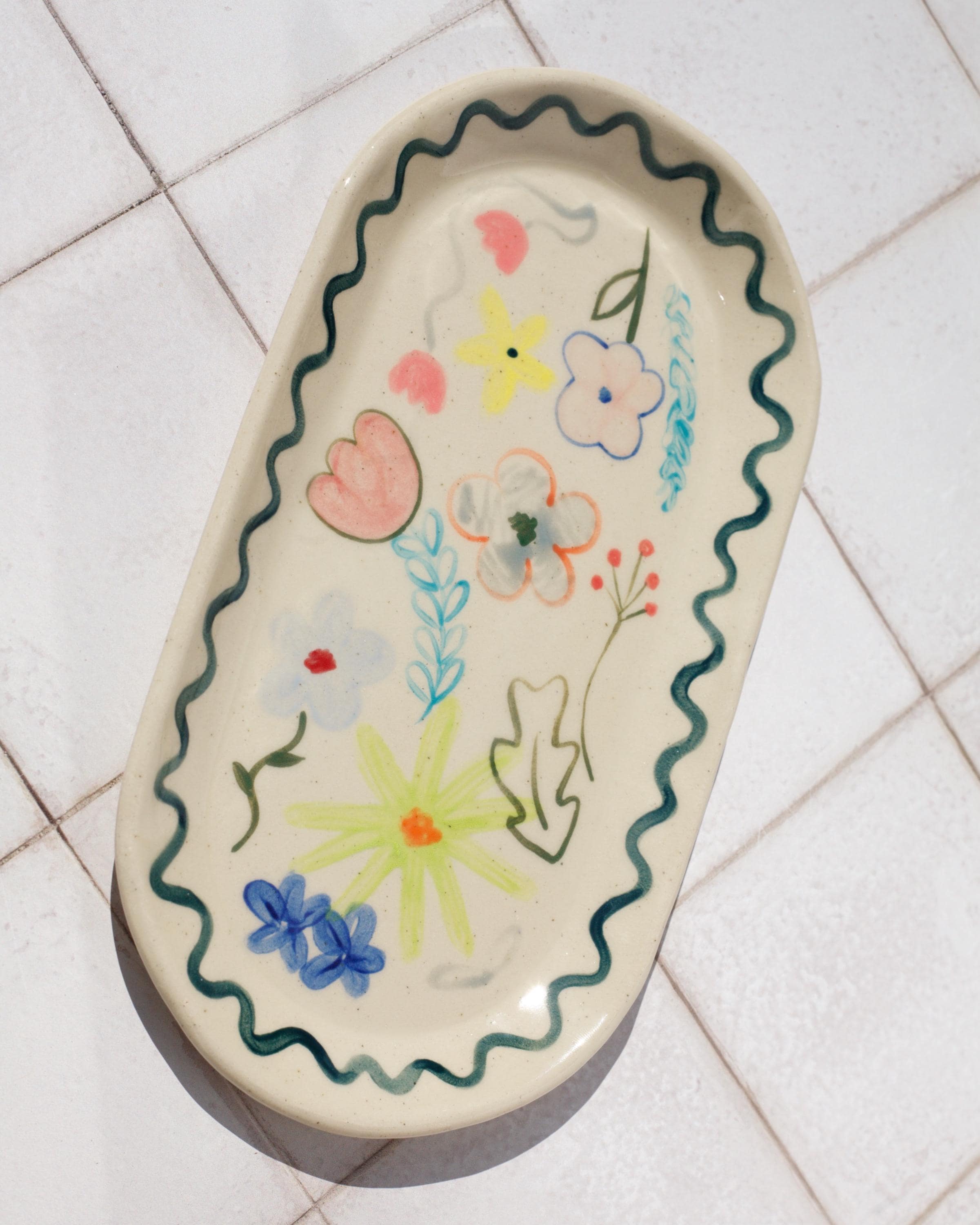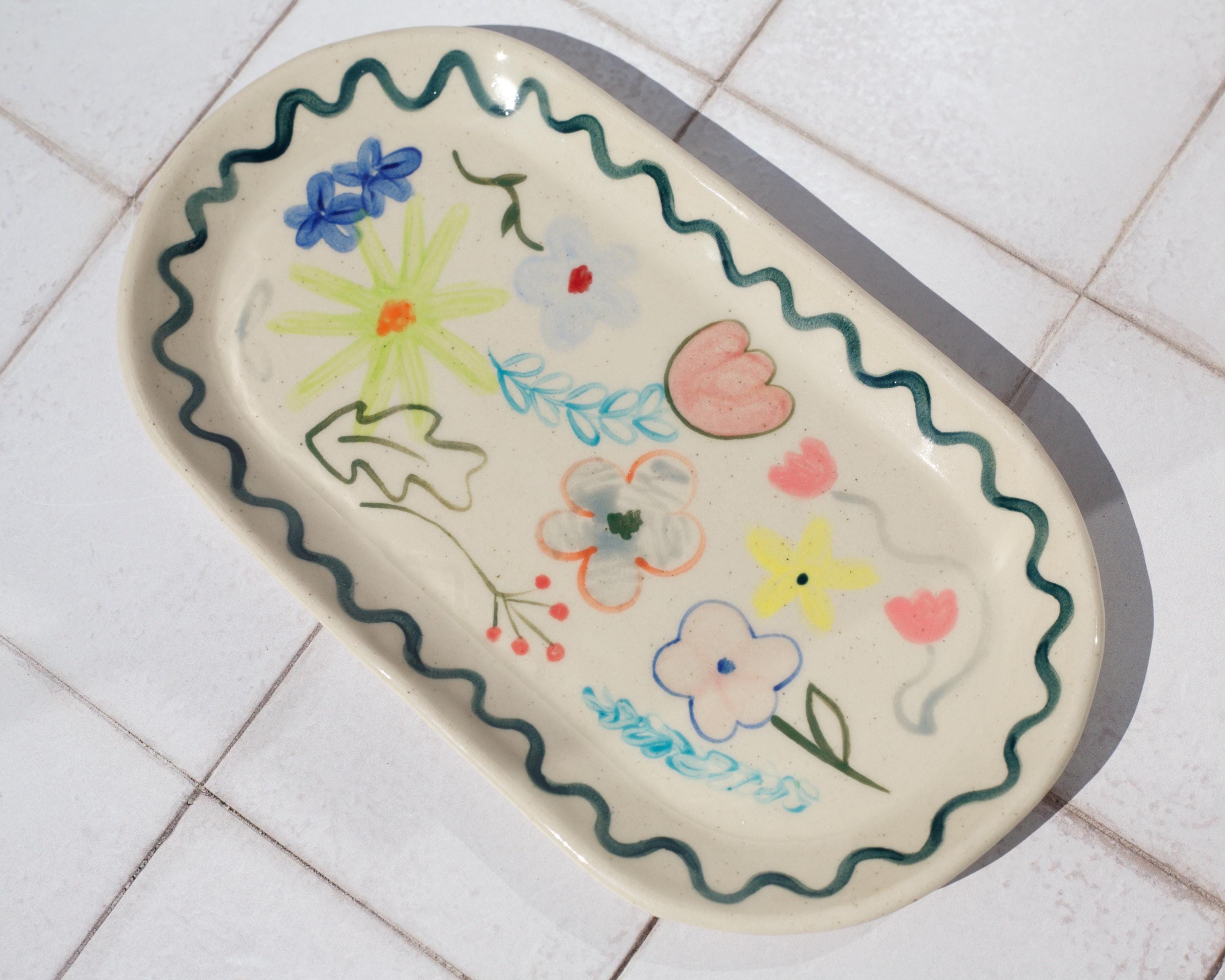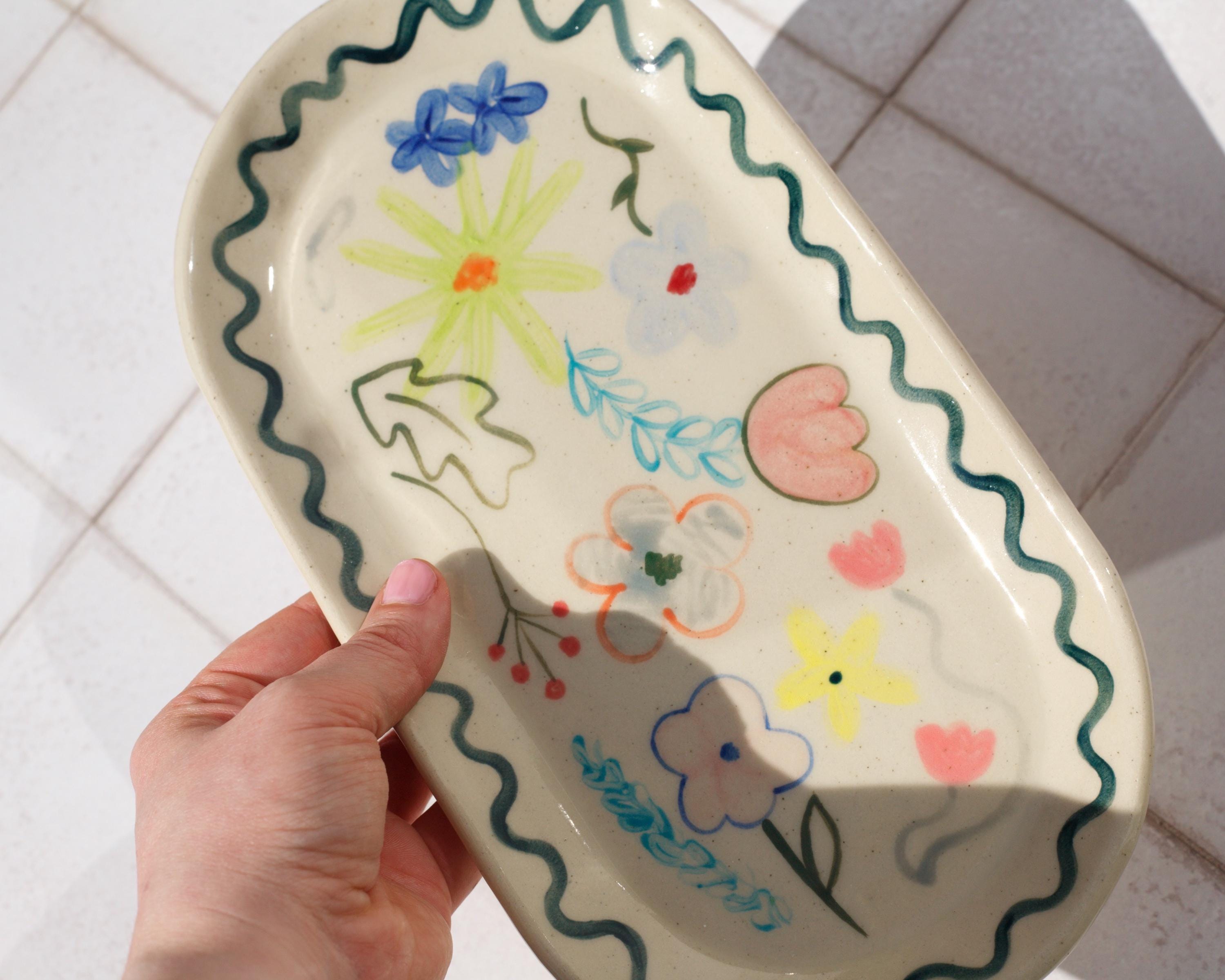 Hand painted abstract floral stoneware tray - Slab built hand made pottery