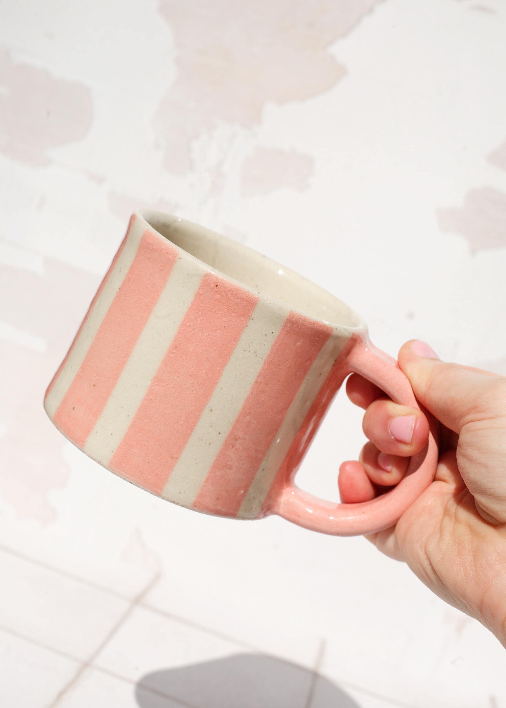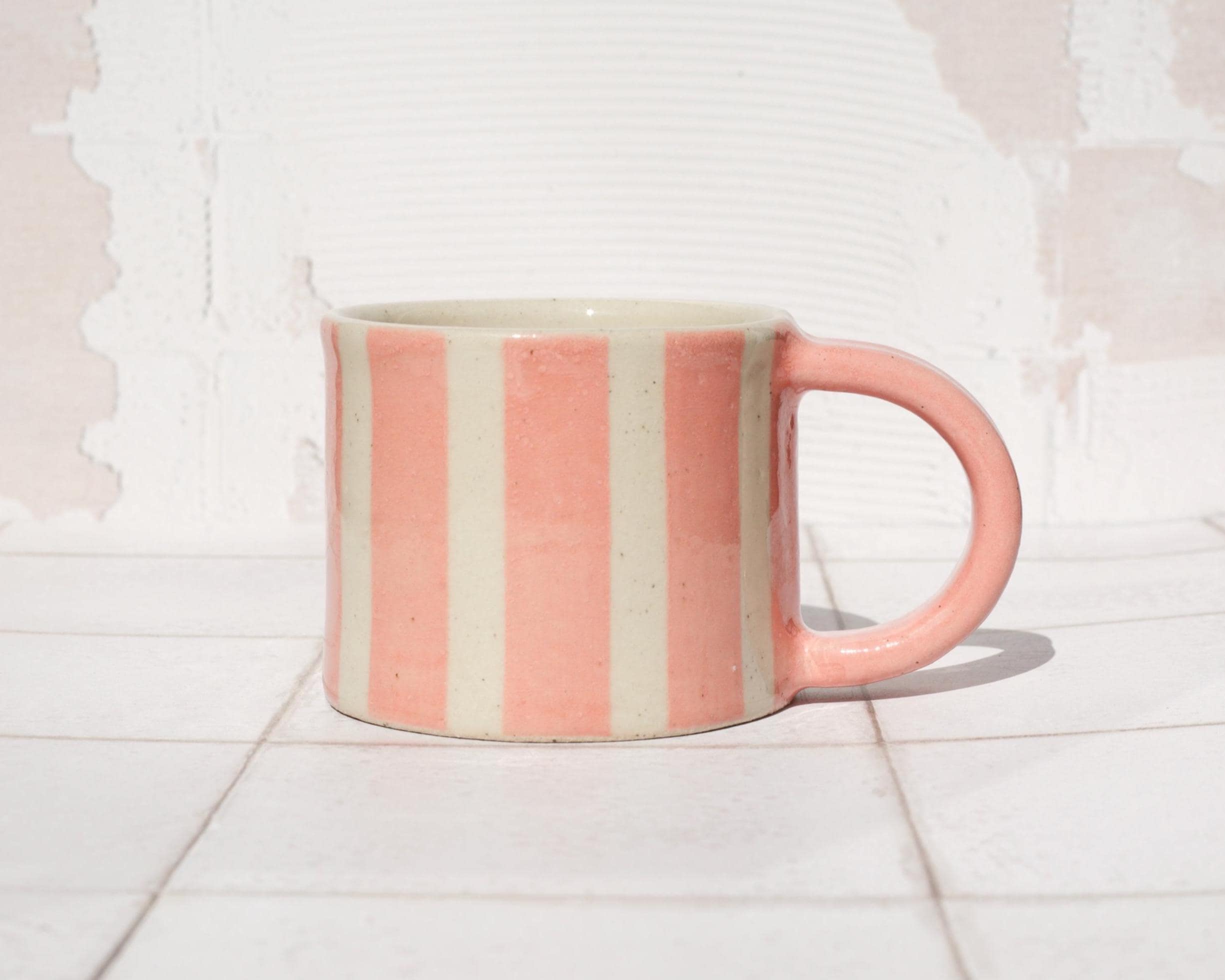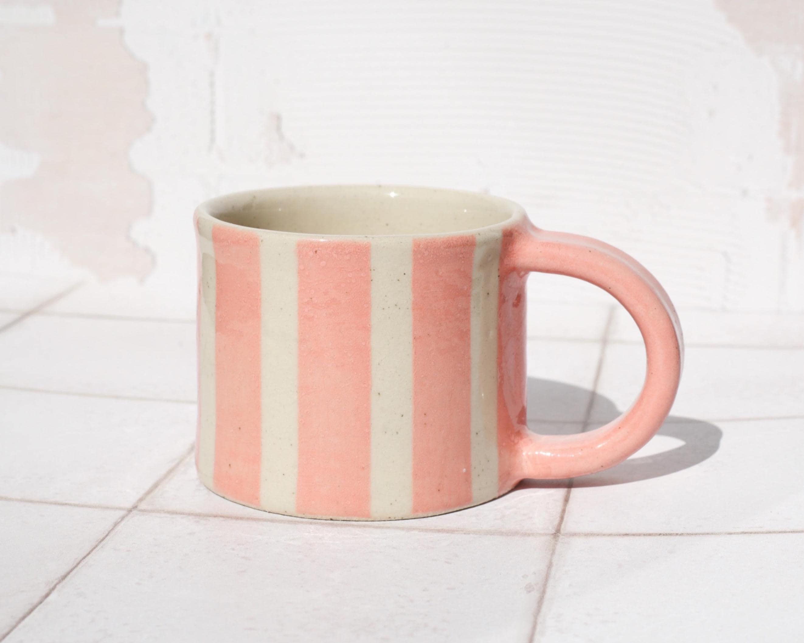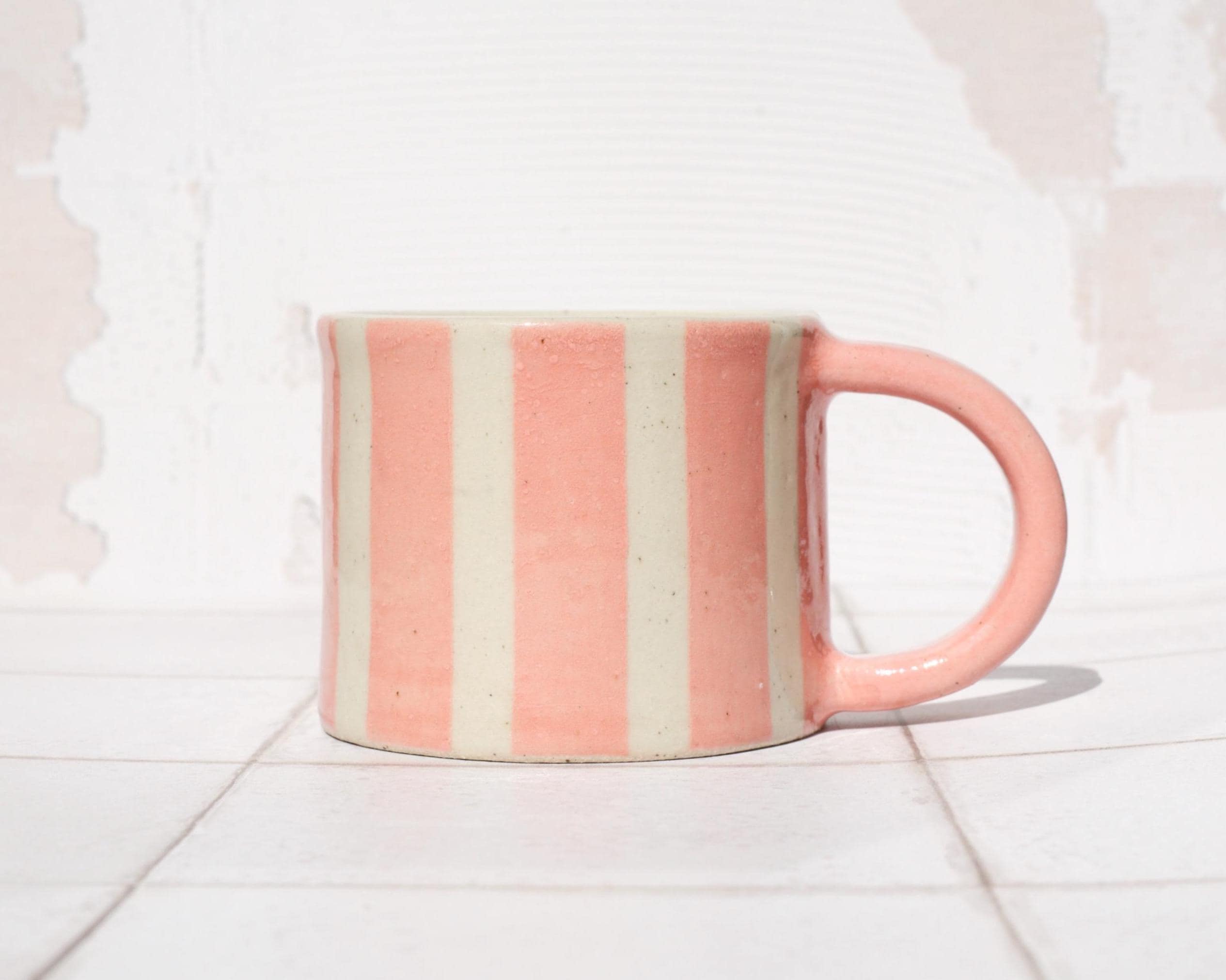 Featuring pink stripe flowers, each mug will appear slightly different due to its hand made nature.